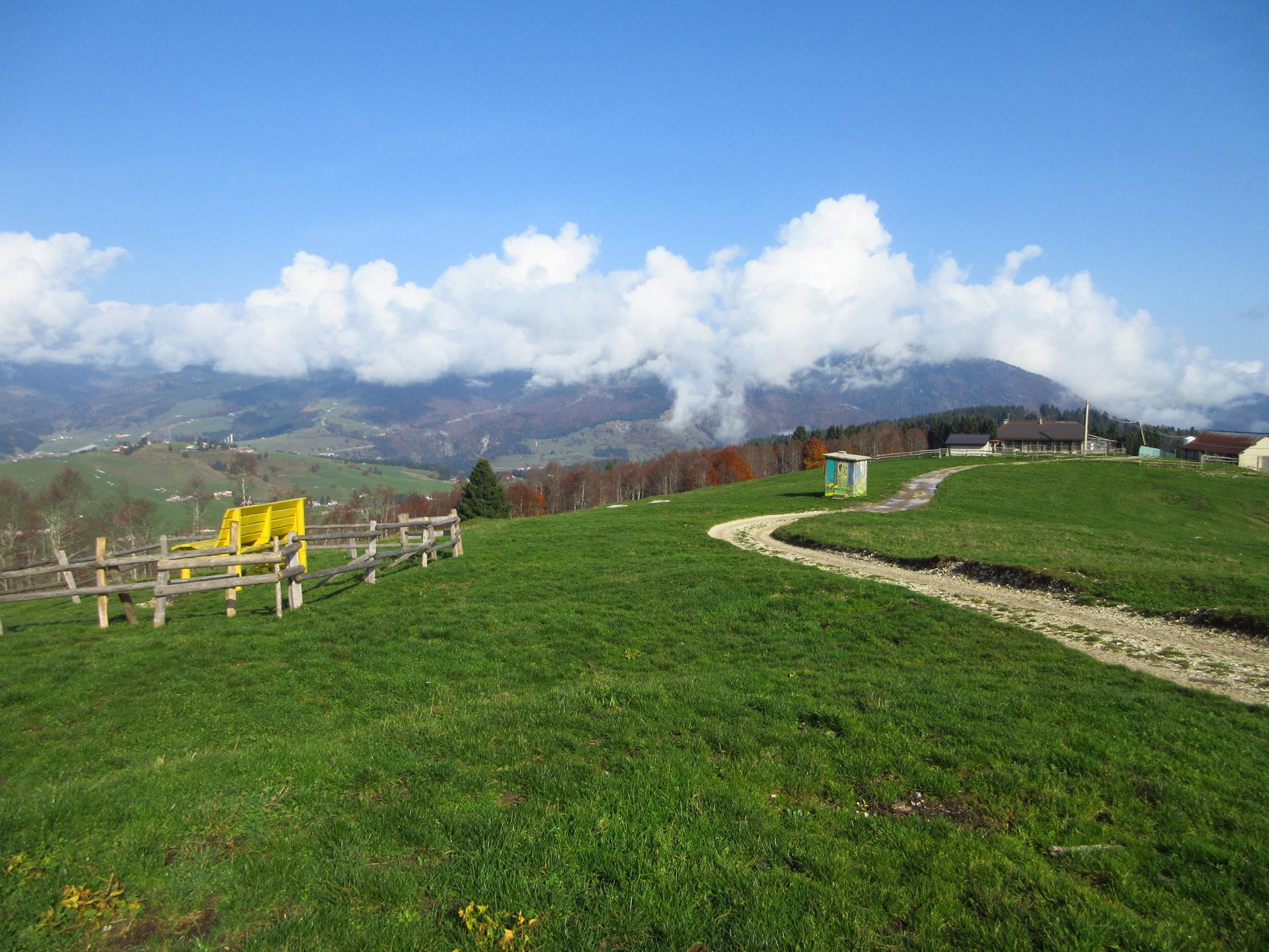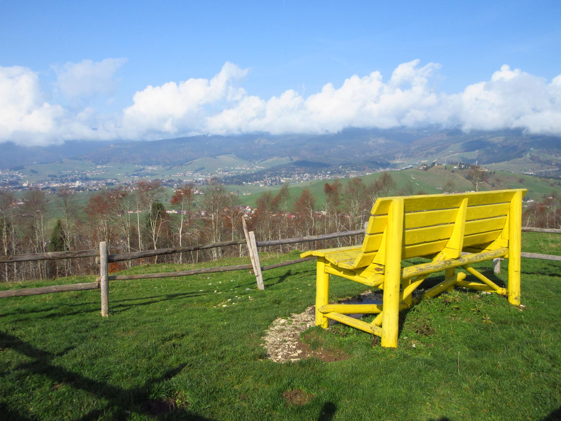 Superata la malga si arriva alla panchina gialla gigante con il suo panorama dell'altopiano.
