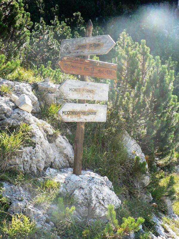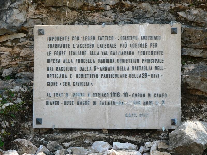 Altre tabelle indicano punti logistici della Grande Guerra come il Corno di Campo Bianco, poi uno sguardo alla strada percorsa verso il Bivacco Tre Fontane.