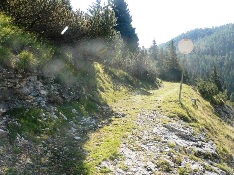 Lasciata la macchina al bivio di malga Galmarara, dove inizia il divieto di circolazione per i veicoli a motore, abbiamo seguito la strada, tutta in salita, verso Bivio Italia. E' possibile utilizzare il sentiero 830 che si stacca dalla strada e prosegue attraverso mughi, ma lo sconsiglio, oltre ad essere più difficile con continui saliscendi, è anche meno panoramico.