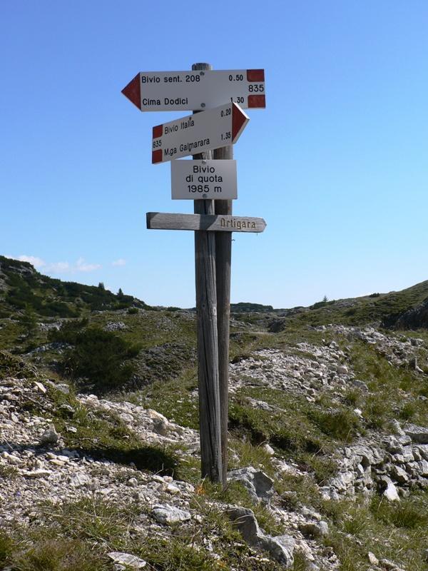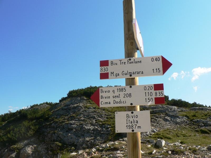 Dopo solo 15 minuti si arriva a Bivio Italia (m 1987). Da qui inizia il sentiero 835 che porta a Cima Dodici e che abbiamo seguito.