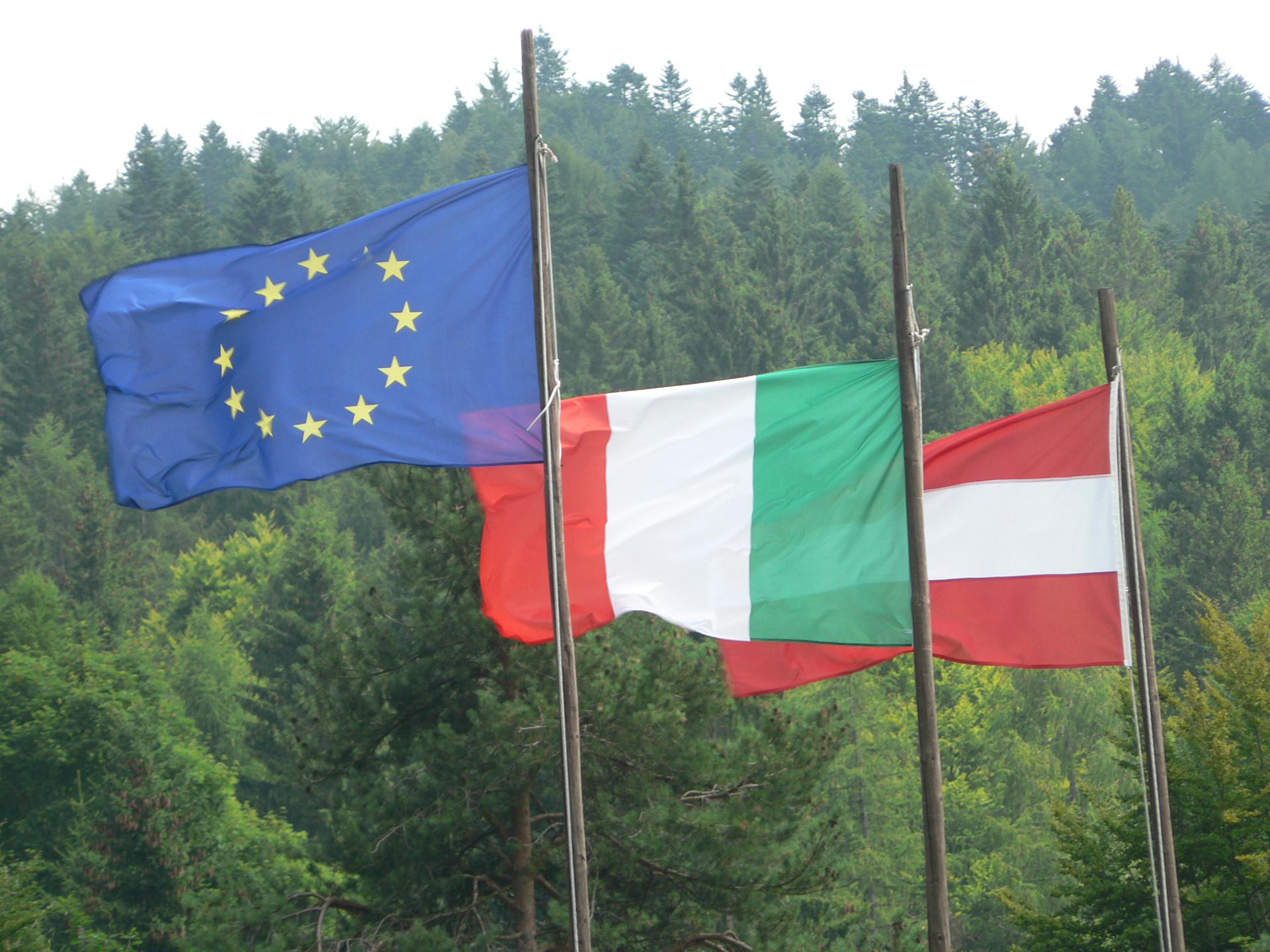 Sotto le bandiere delle due nazioni in guerra, adesso ancora più unite dalla bandiera dell'Europa, il silenzio abbraccia i caduti di un tempo.