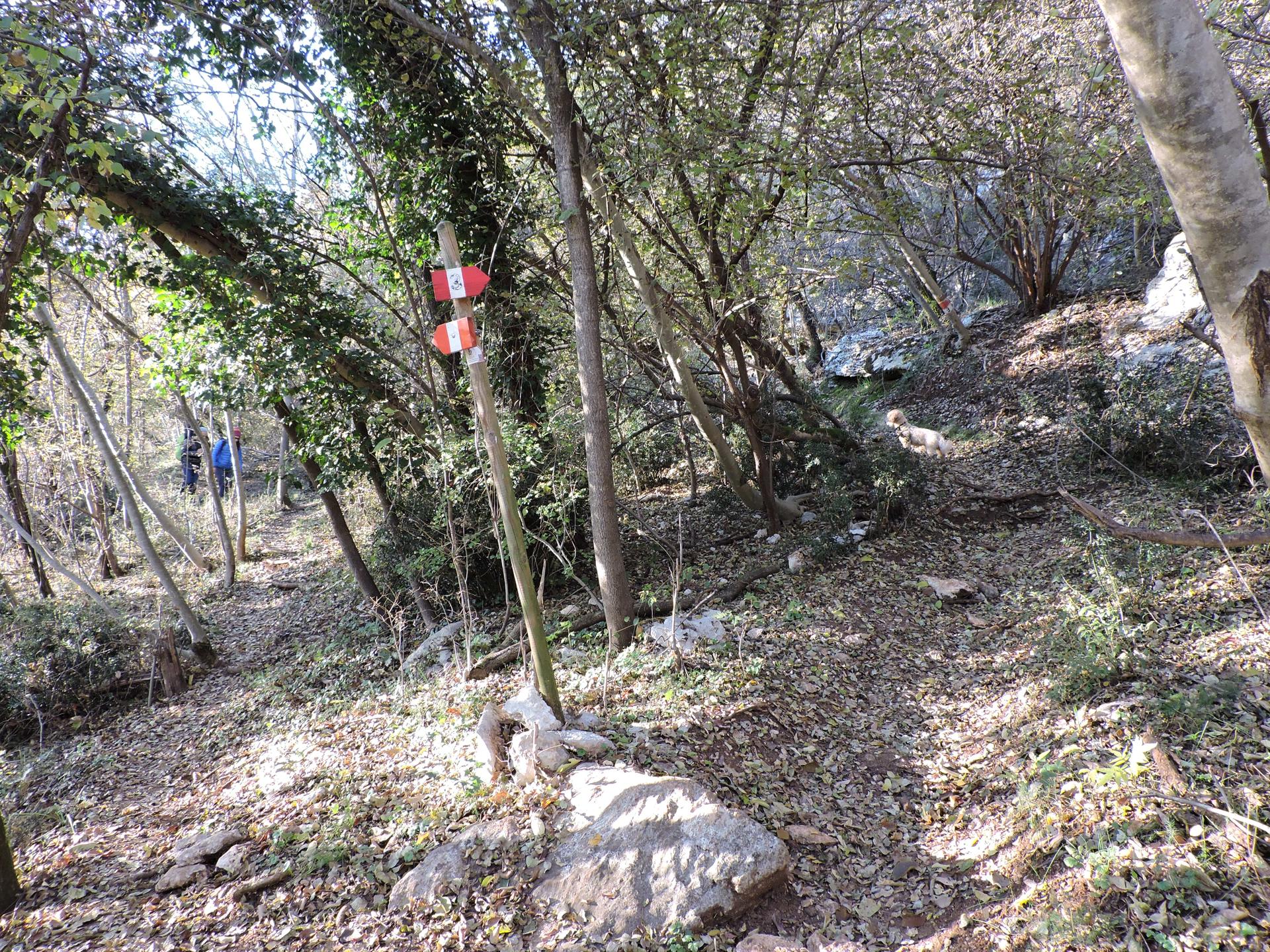 Con un'ampia curva il sentiero punta adesso verso ovest. All'incrocio in foto si prosegue in salita a destra. Un cartello avvisa della presenza di cinghiali.