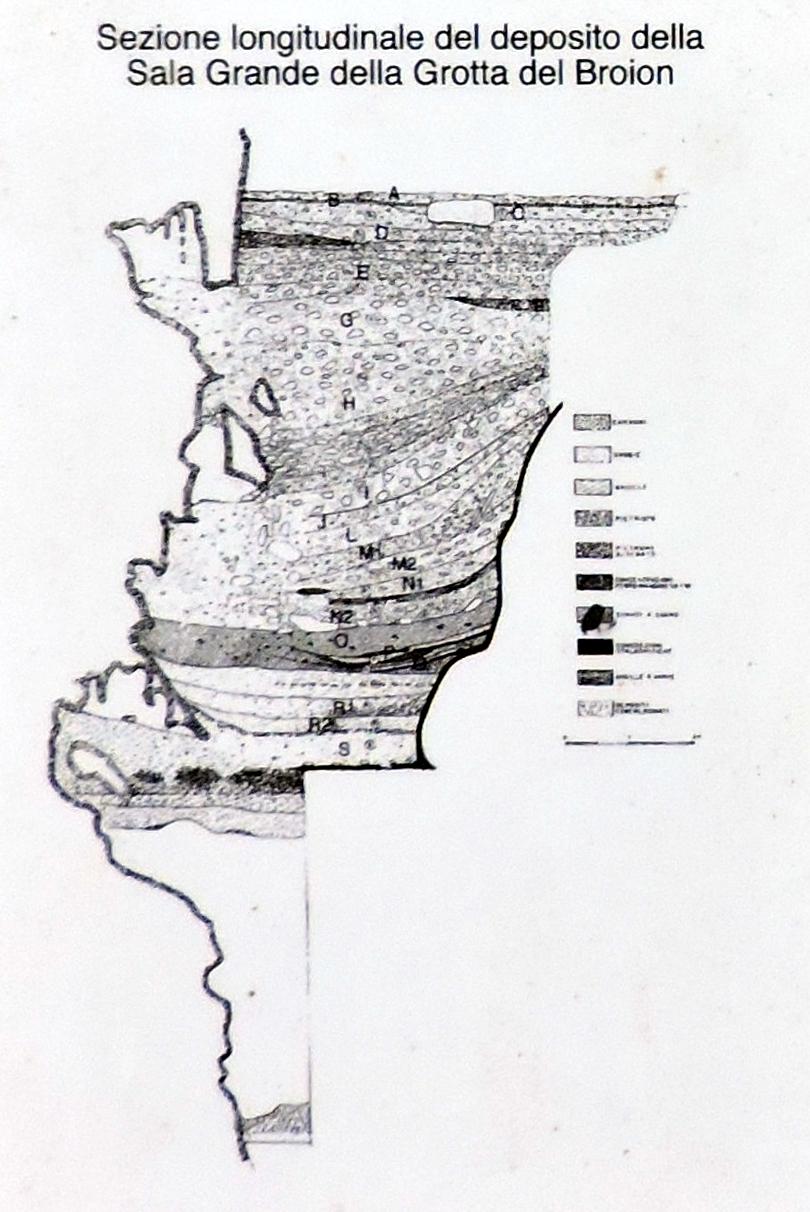 Nel deposito della Grotta del Broion vi sono le evidenze di più frequentazioni, all'incirca tra 80.000 e 40.000 anni da oggi. Un primo gruppo di raschiatoi e di punte di selce è stato trovato negli strati R-O, che rispecchiano un ambiente di prateria fredda, con pochi alberi; tra gli animali prevalgono lo stambecco, il camoscio, l'alce, l'uro.