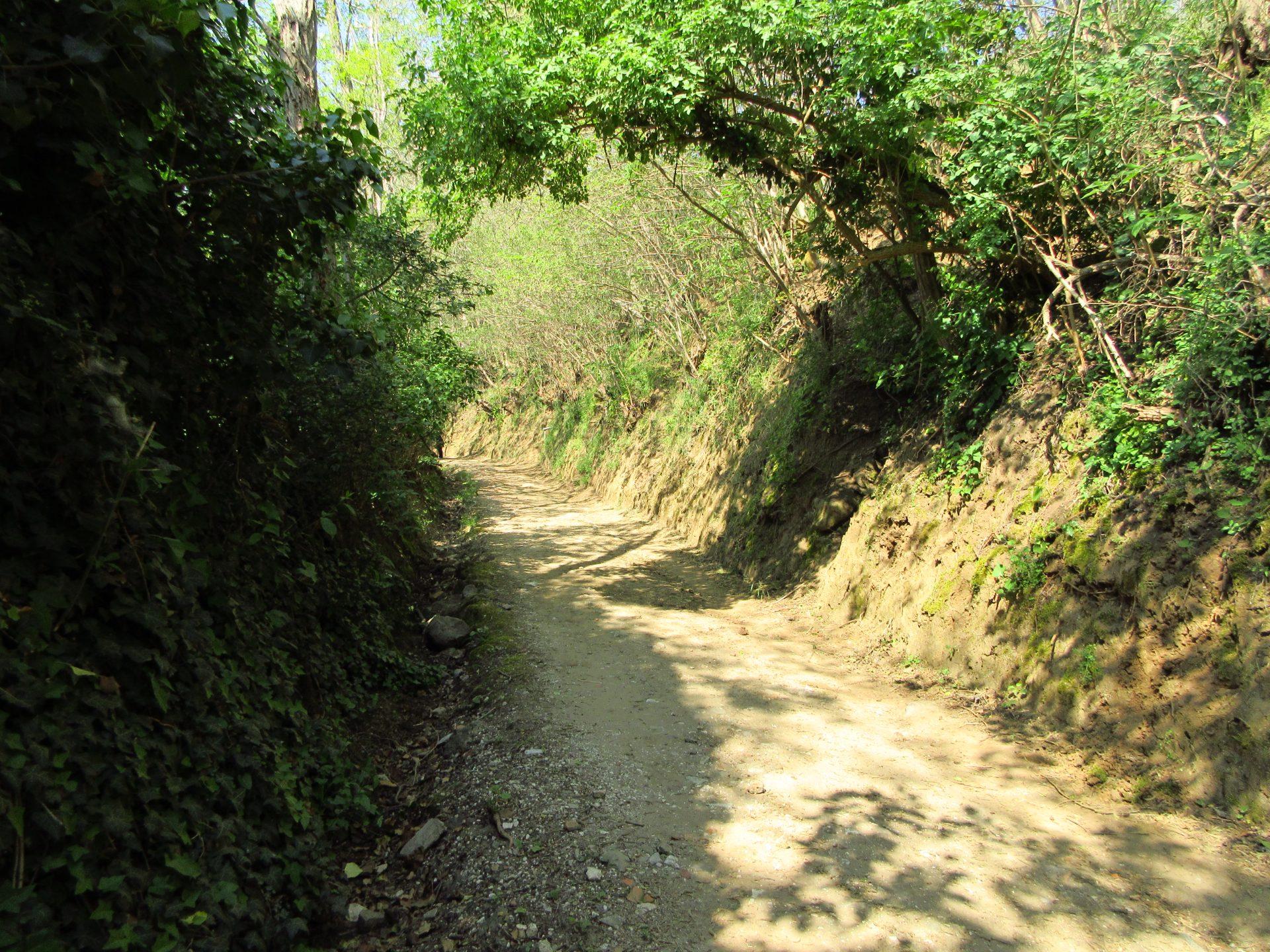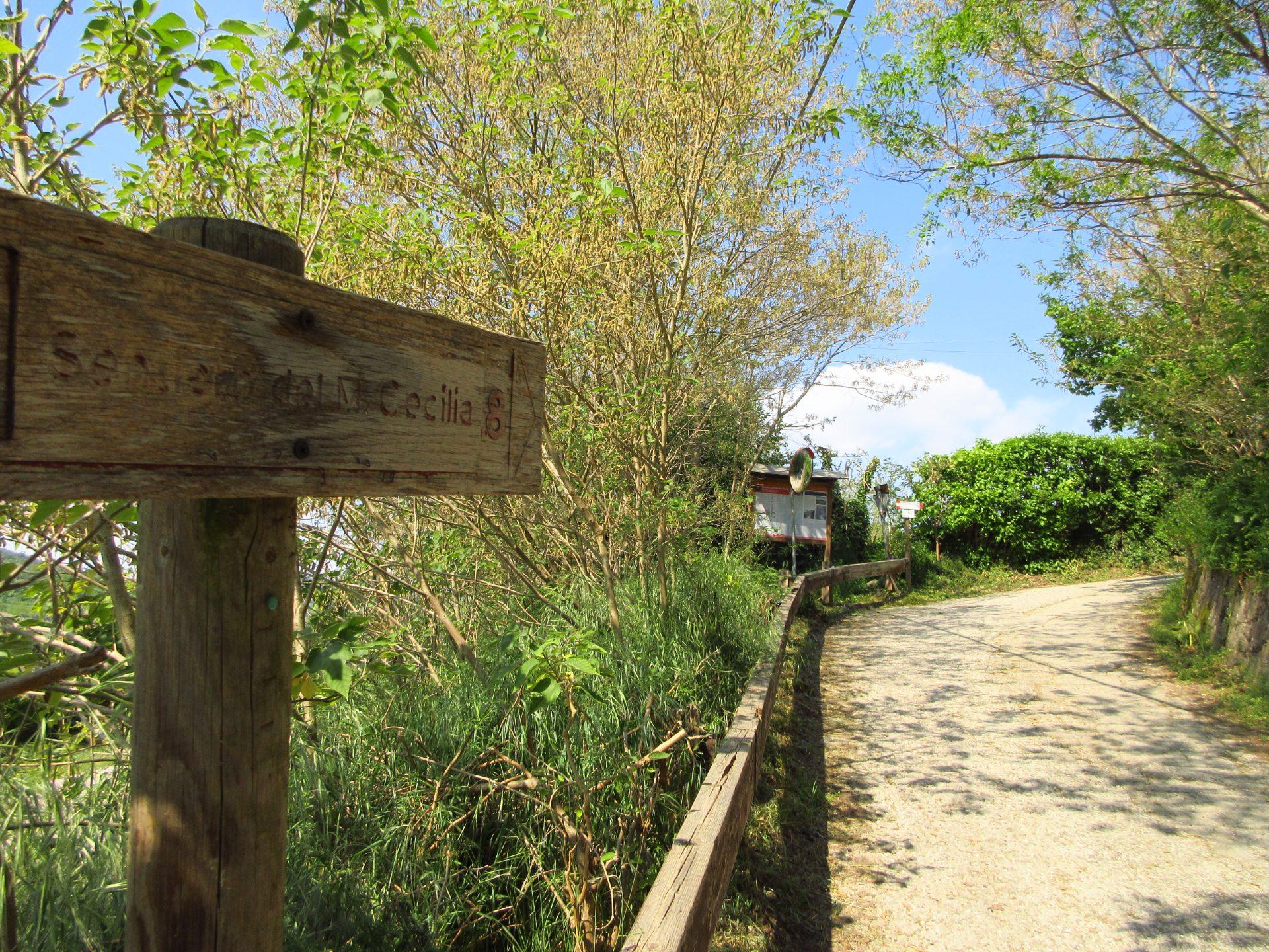 Proseguendo nel bosco si raggiunge un sentiero che si stacca sulla sinistra e sale fino alla cima di Monte Cecilia, un luogo che in passato ospitava un castello.