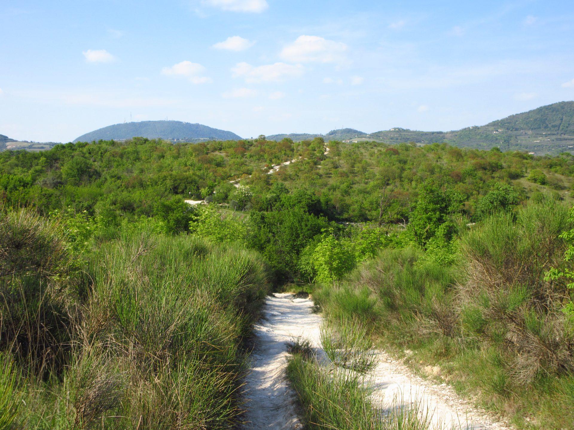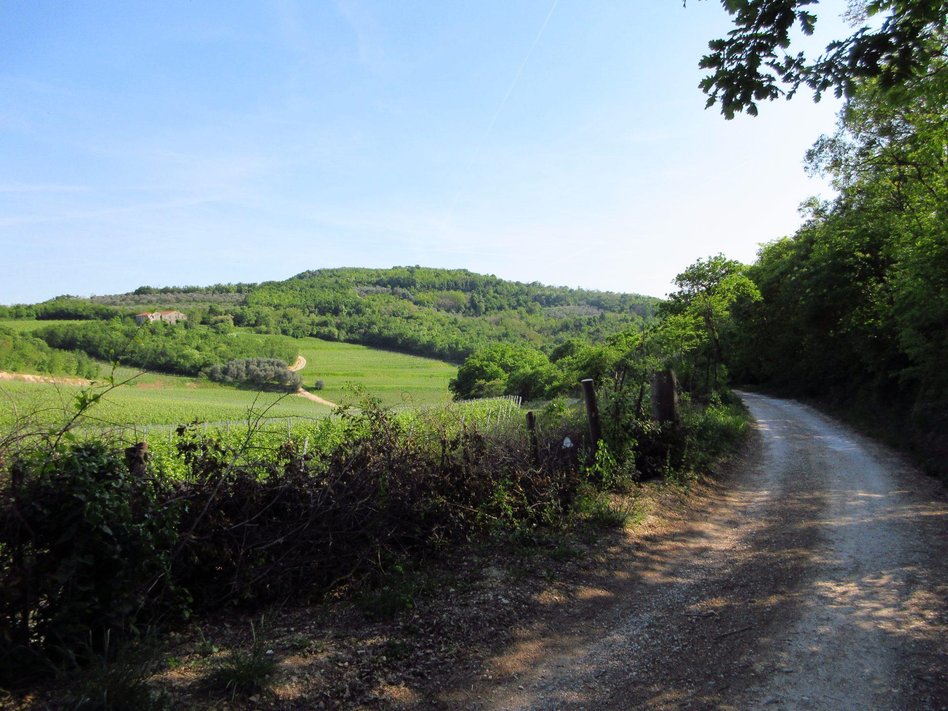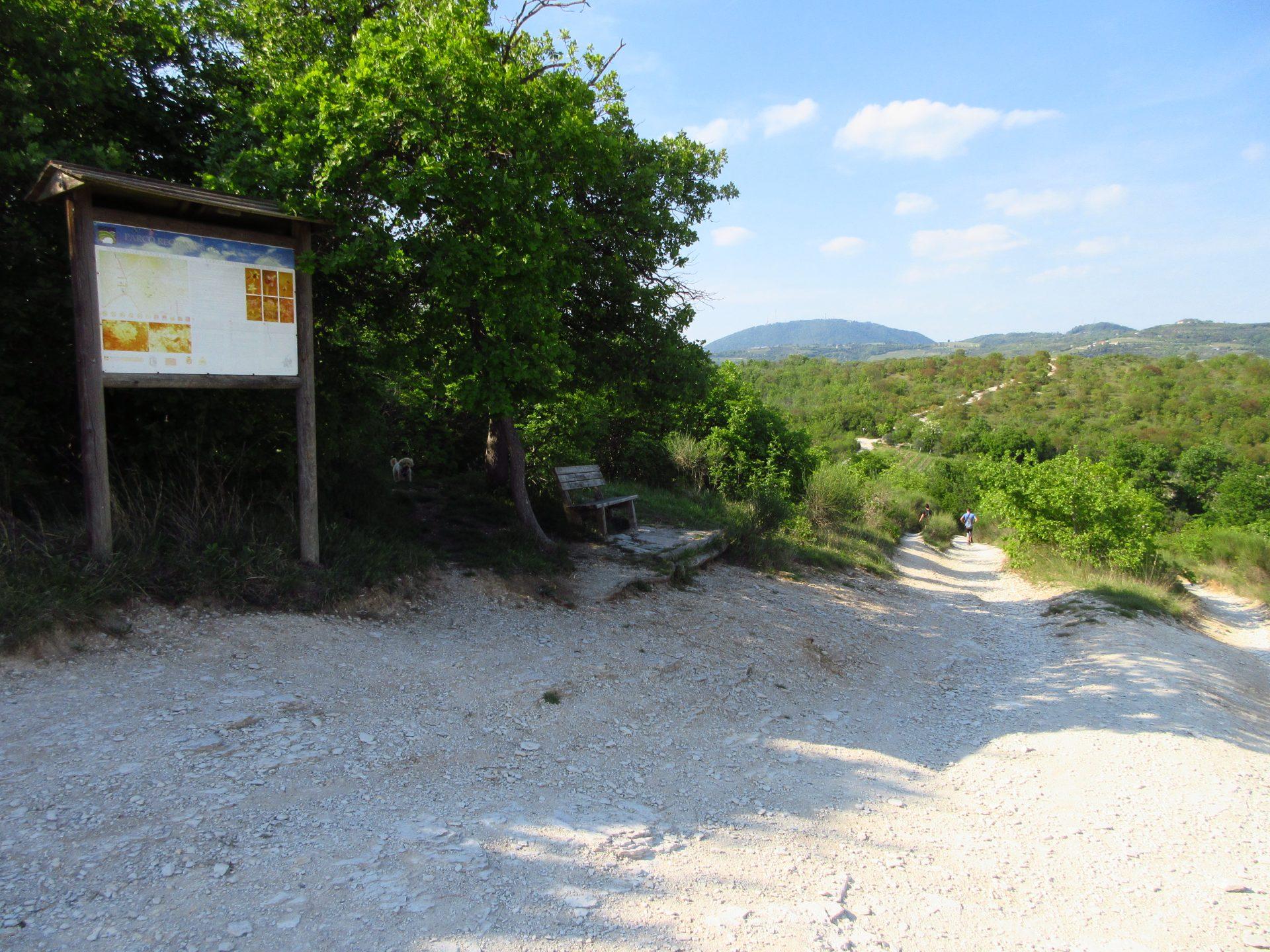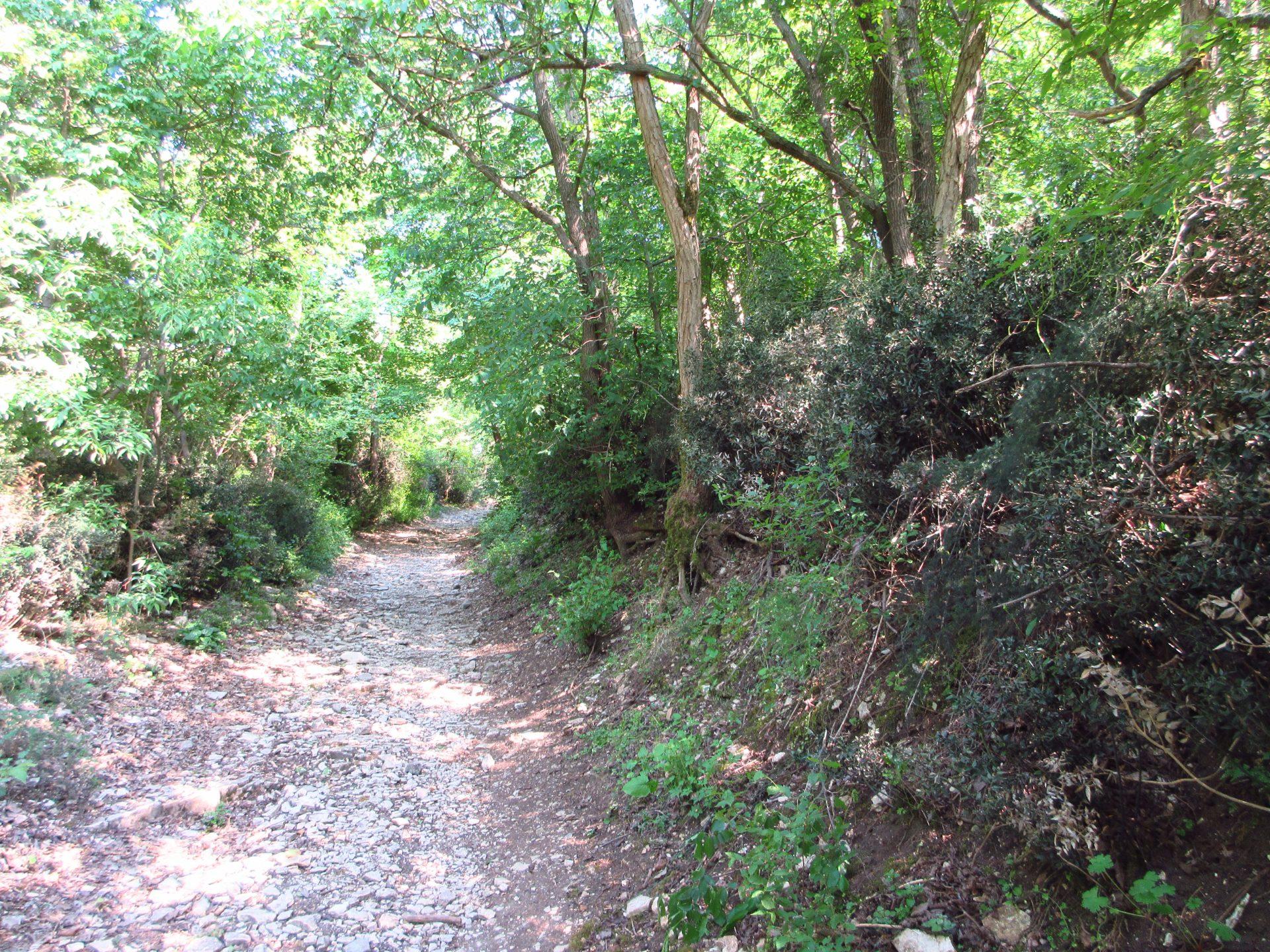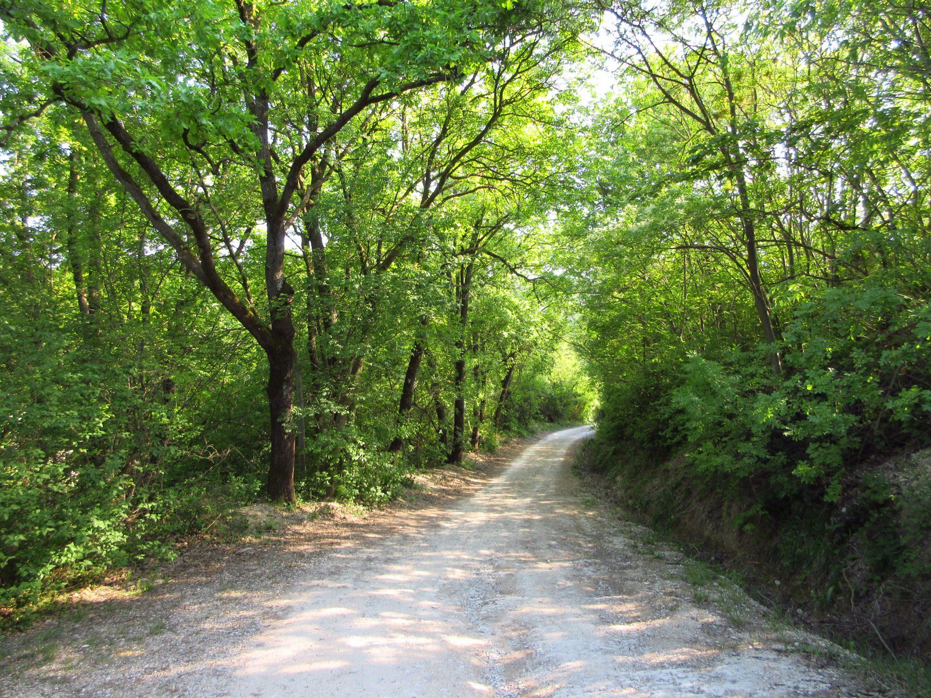 Dopo poco l’asfalto lascia spazio a una strada dal fondo naturale. La salita è regolare e mai troppo impegnativa. Superato un uliveto, il percorso si inoltra nel bosco.