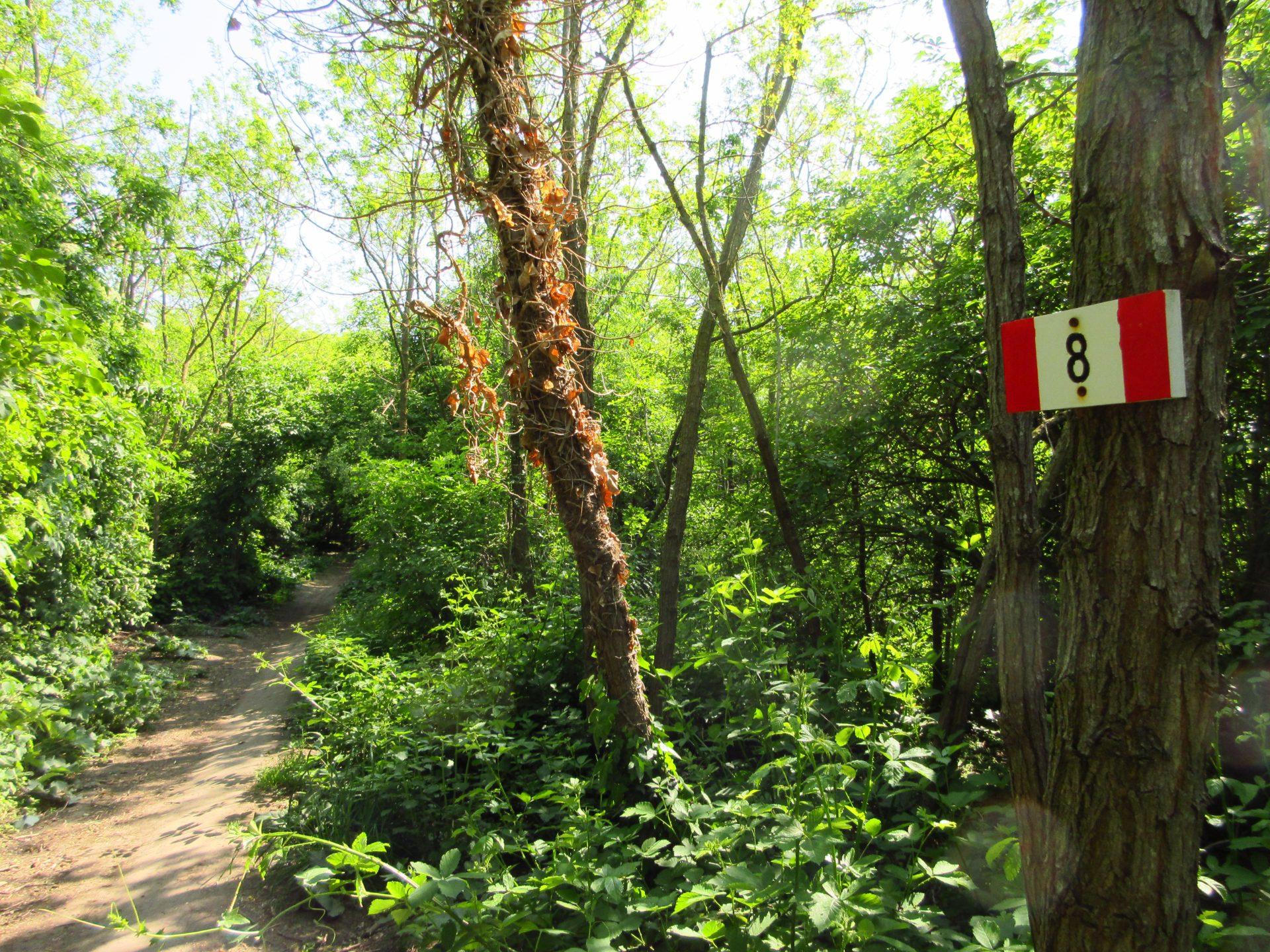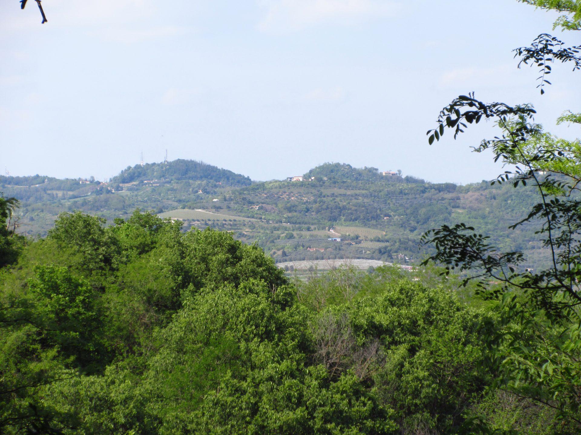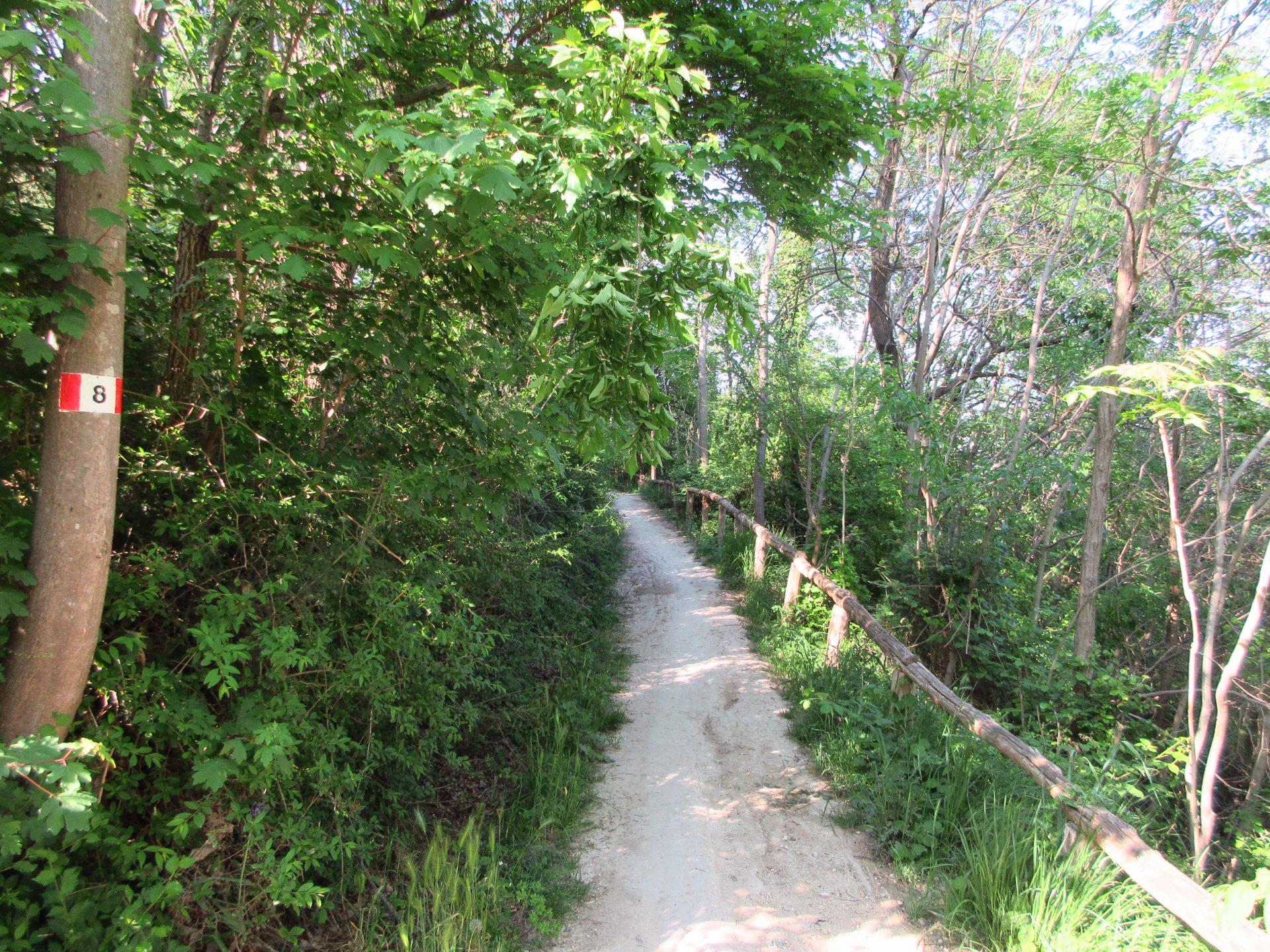 Poco oltre si trova sulla sinistra il sentiero n. 8A, che permette di chiudere l’anello tornando all'incrocio incontrato all'andata ed evitando circa 500 metri di strada provinciale priva di marciapiede. Il nostro percorso prosegue invece lungo il sentiero principale n. 8. Vale però la pena continuare ancora per circa 200 metri prima di prendere l’8A, perché il sentiero esce dal bosco e offre un panorama davvero fantastico.