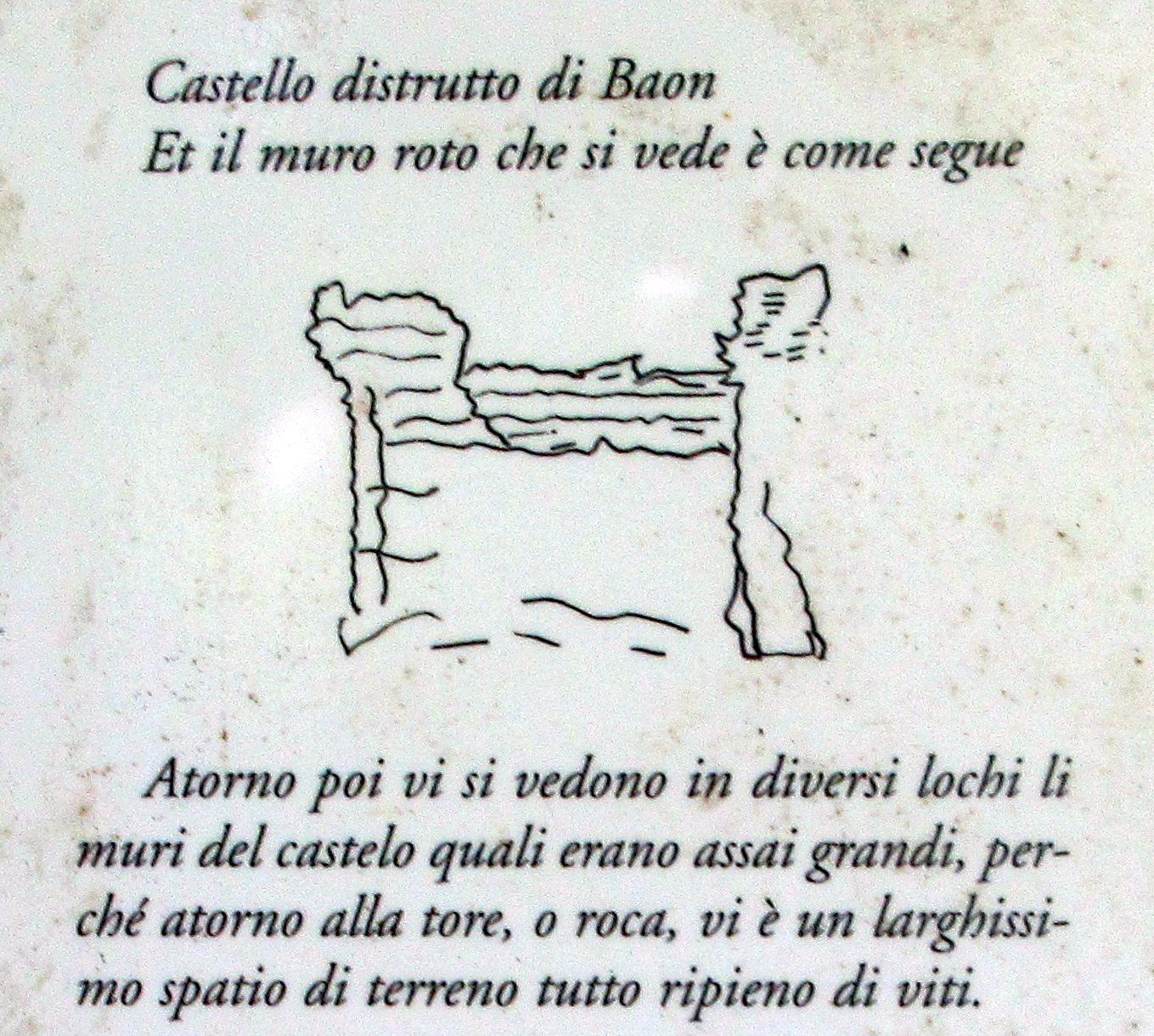 "Il Monte di Baone ha un castello nella sommità distrutto et ancora vi si vede un grosso muro in piedi, di larghezza piedi 5, qual era della torre che sta nella somità, la qual ha dentro ancora alcuni compartimenti di muro nel modo infrascritto et è come il disegno in piato