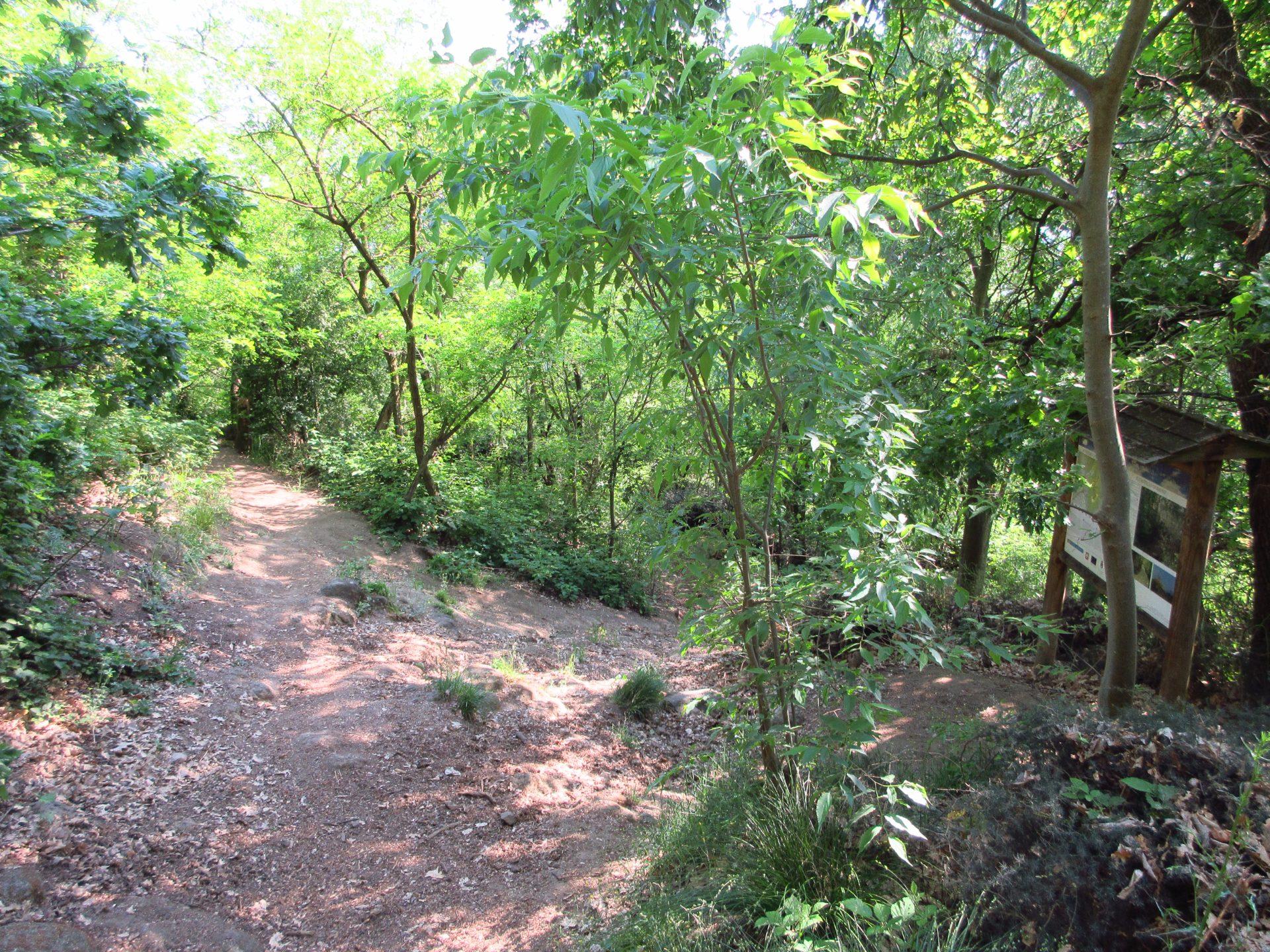 Il sentiero si snoda per la maggior parte nel bosco prevalentemente di robinia, con la presenza in più tratti di altre specie di alberi e arbusti, tra cui l'olmo, il gelso della Cina (Broussonetia papyrifera), l'orniello (Fraxinus ornus), il bagolaro (Celtis australis), il sambuco (Sambucus nigra), l'acero campestre, tra i cespugli, il biancospino (Crataegus monogyna) e la rosa di macchia (Rosa canina). Presso la cima il bosco è prevalentemente formato da ornielli, carpini neri e qualche roverella. Il sottobosco abbonda di pungitopo e fusaggine (Euonimus europaeus) detta anche "berretta del prete" per la caratteristica forma del frutto.