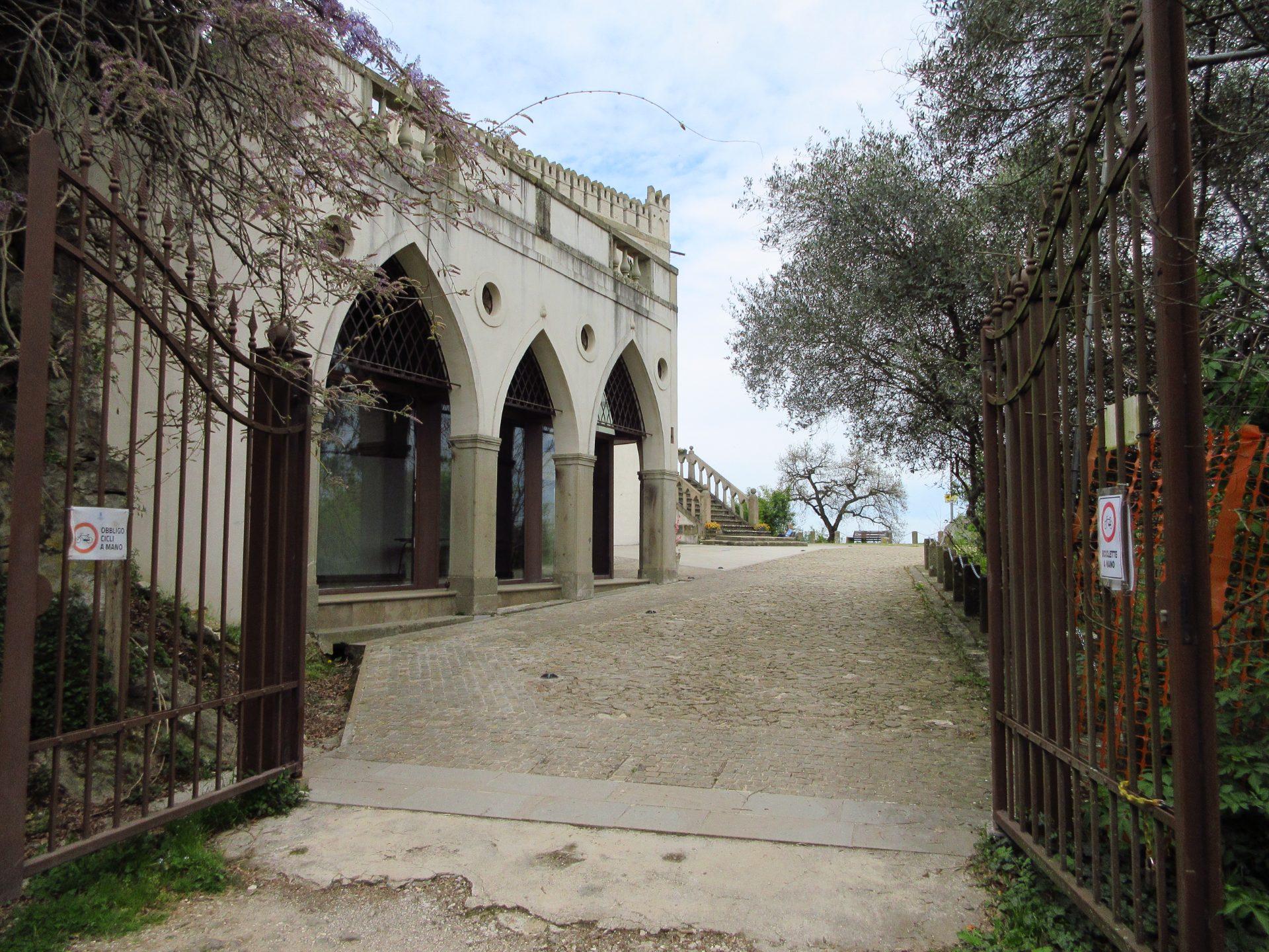 La strada prosegue con un ulteriore tornante verso sinistra, passando accanto alla terrazza superiore della villa, per poi terminare poco più avanti presso un altro cancello che separa l’area della villa dalla parte più naturale del parco.