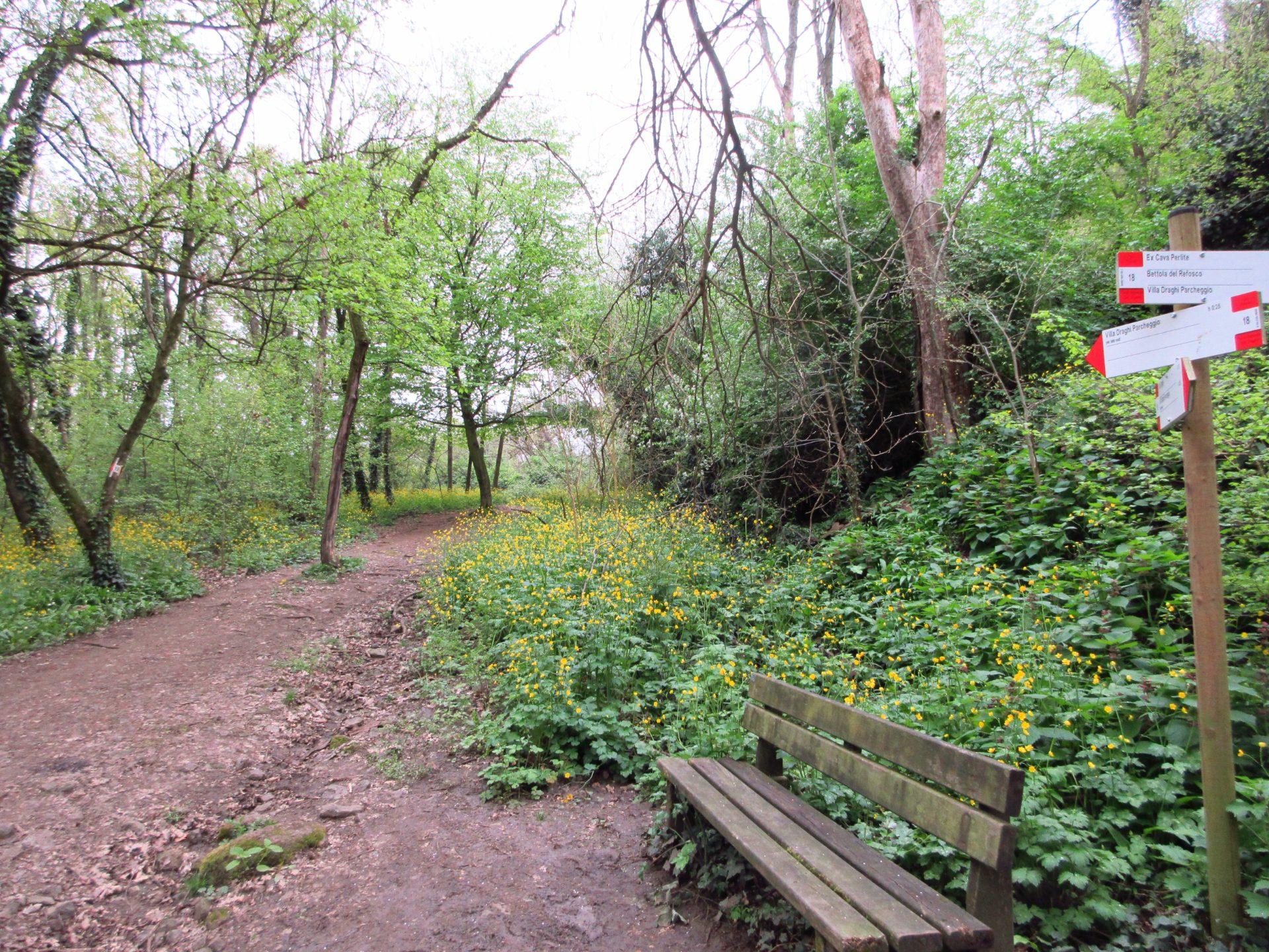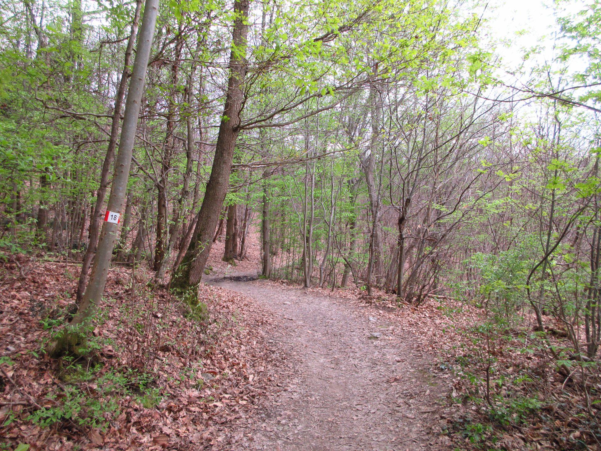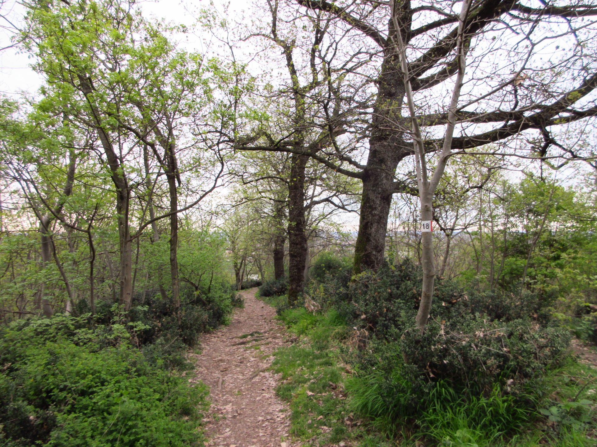 Superato il cancello, si prosegue verso destra in salita. Si raggiunge una radura, spesso utilizzata per i picnic, e si continua seguendo il ben evidente segnavia numero 18.