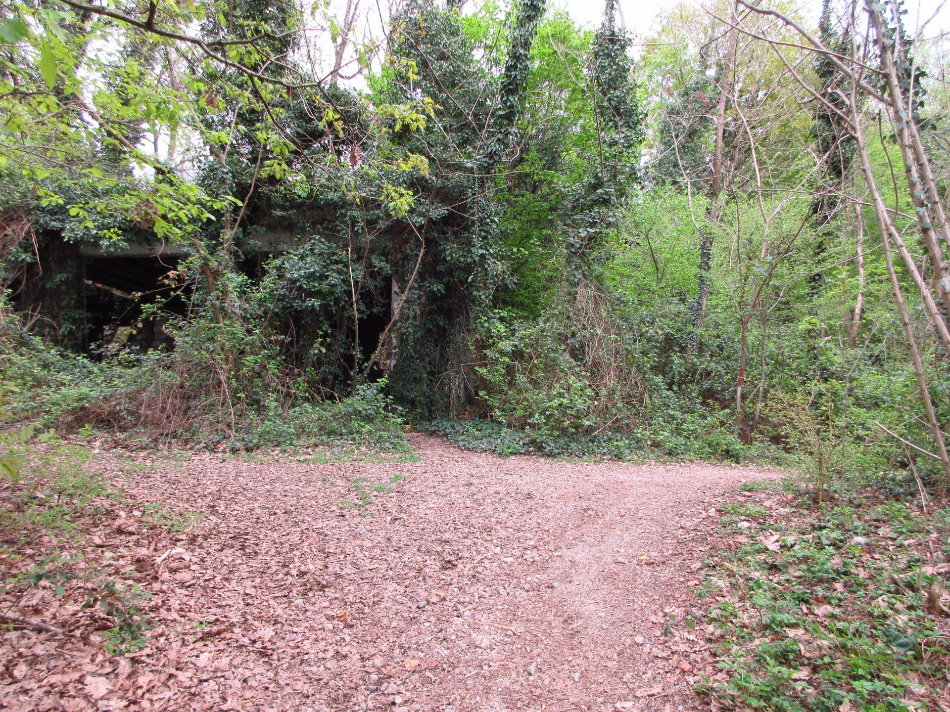 Con un’ampia curva verso sinistra e mantenendosi sempre a sinistra ai successivi incroci, si arriva a un ulteriore bivio dove si nota un edificio, oggi quasi completamente nascosto dalla vegetazione, che poteva forse servire come ricovero o struttura di servizio per la vicina cava.