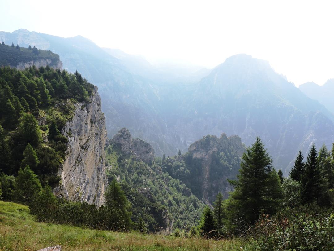 Alla bocchetta si continua sulla destra. Il sentiero rimane scoperto, con un piccolissimo tratto nel bosco, e già si può ammirare il panorama delle sottostanti valli.
