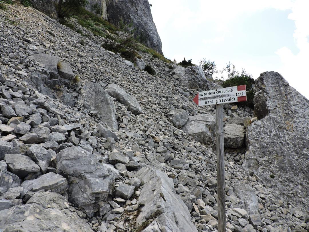 Per raggiungere il Corno Battisti esistono altri sentieri, uno tra questi è una mulattiera militare con passaggi in galleria. Un particolare interessante di questo percorso è proprio sotto al Corno Battisti denominato Pozzo della Carrucola. Questo pozzo è una galleria verticale e percorribile per i più audaci e con attrezzature adatte. Decidiamo di visitare questo pozzo.