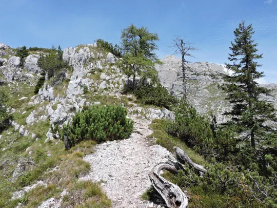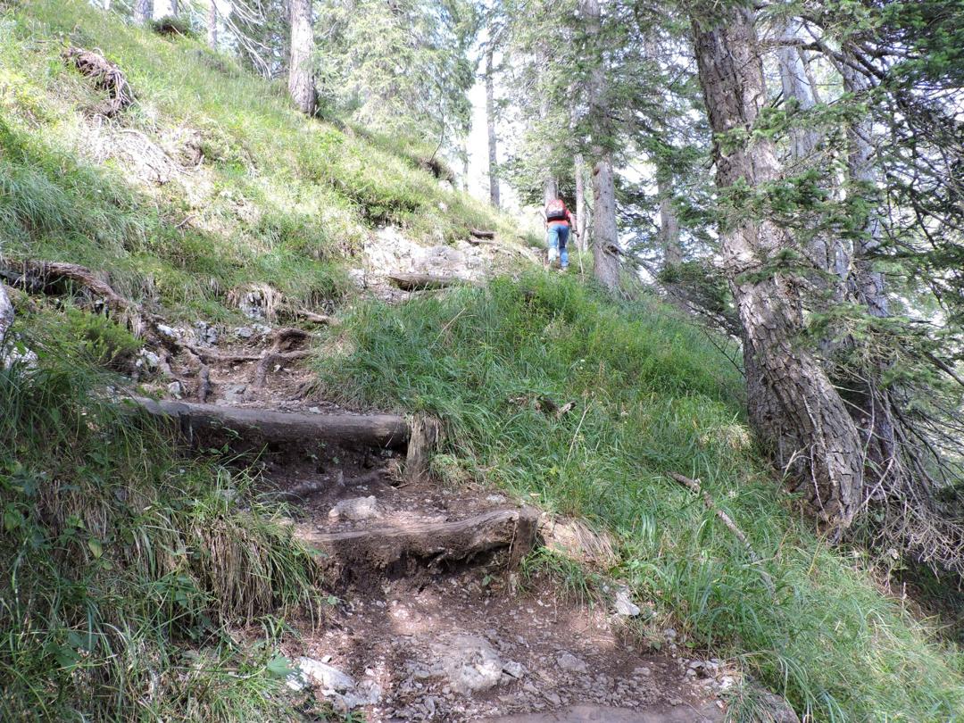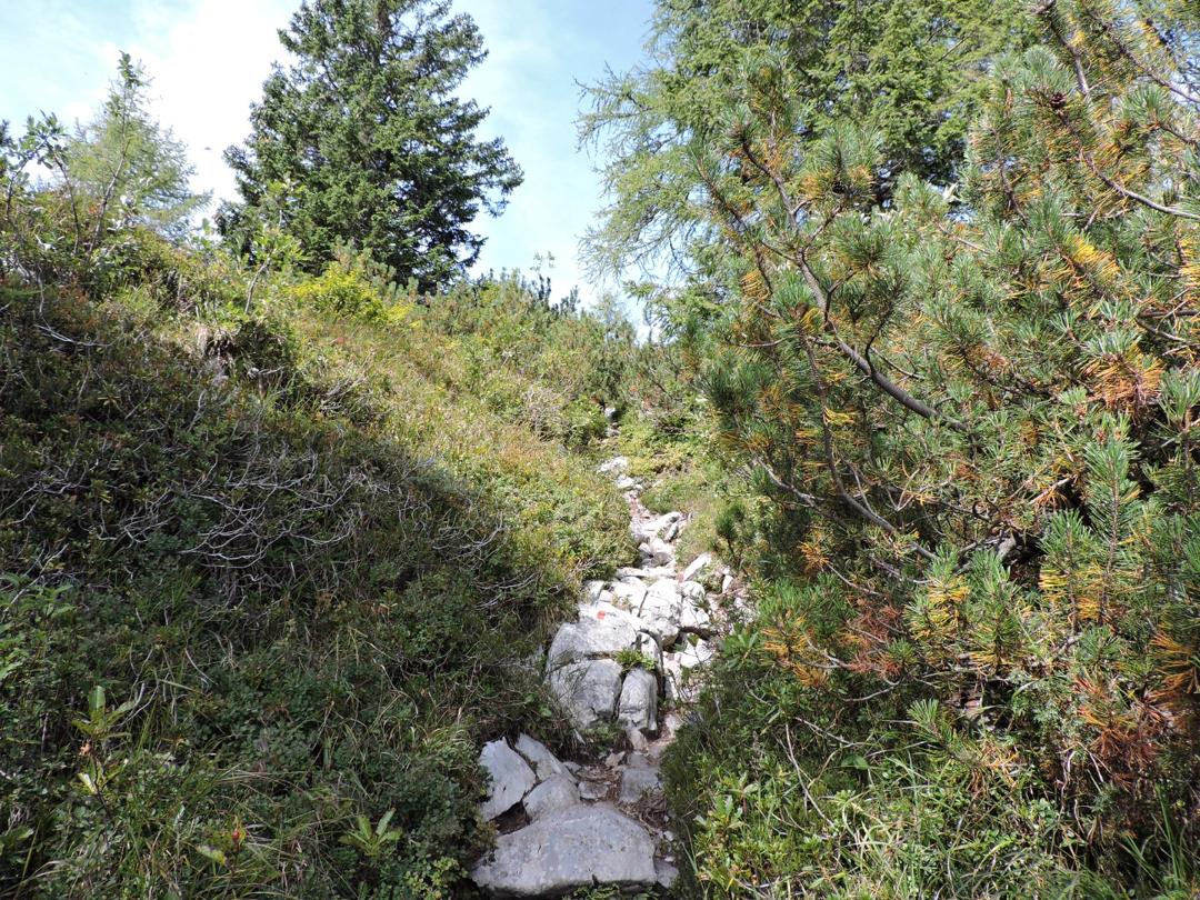 A quota 1811 di Palon del Tovre si esce dal bosco ed iniziano i pini mughi. Il sentiero rimane per un po' sulla cresta per poi lasciarla scendendo leggermente sulla destra.