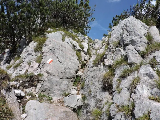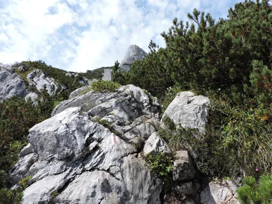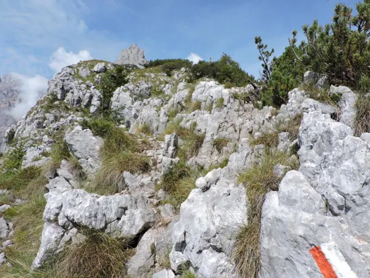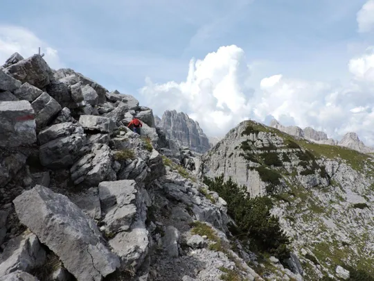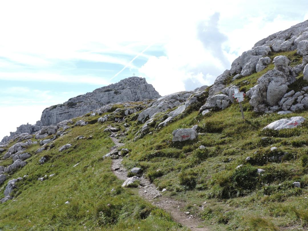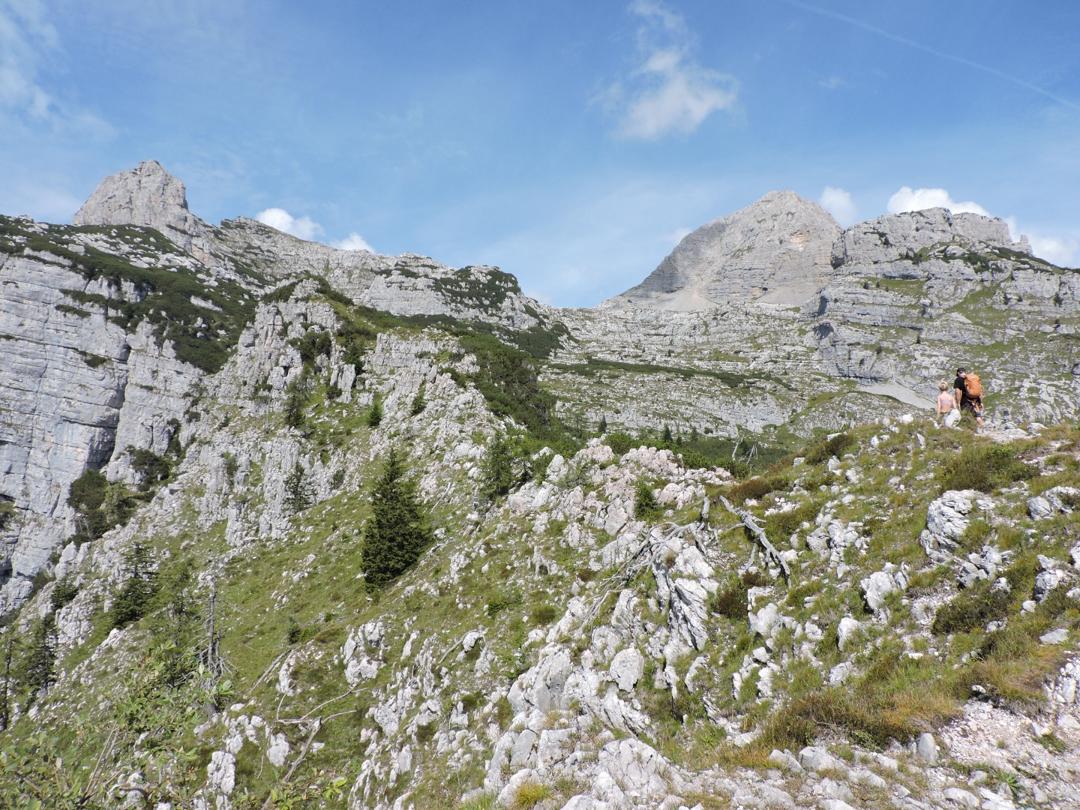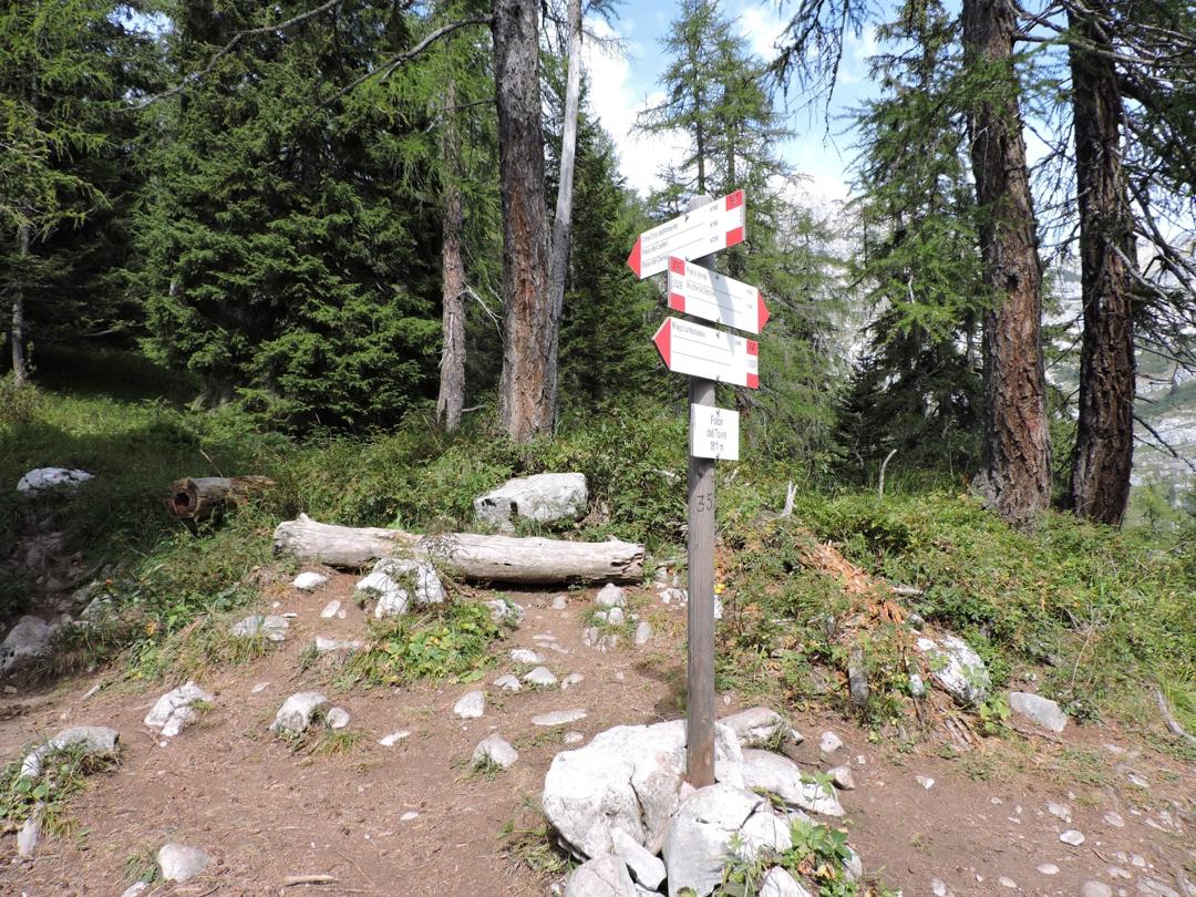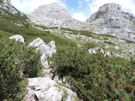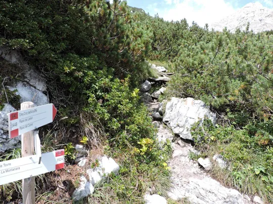 La cima che vogliamo raggiungere è lì, di fronte a noi, a più di 800 metri di dislivello. Seguiamo la strada in direzione nord che porta verso il rifugio Croz dell'Altissimo per circa 200 metri. La strada curva verso nord-ovest mentre il nostro sentiero (ben segnalato) continua verso nord.