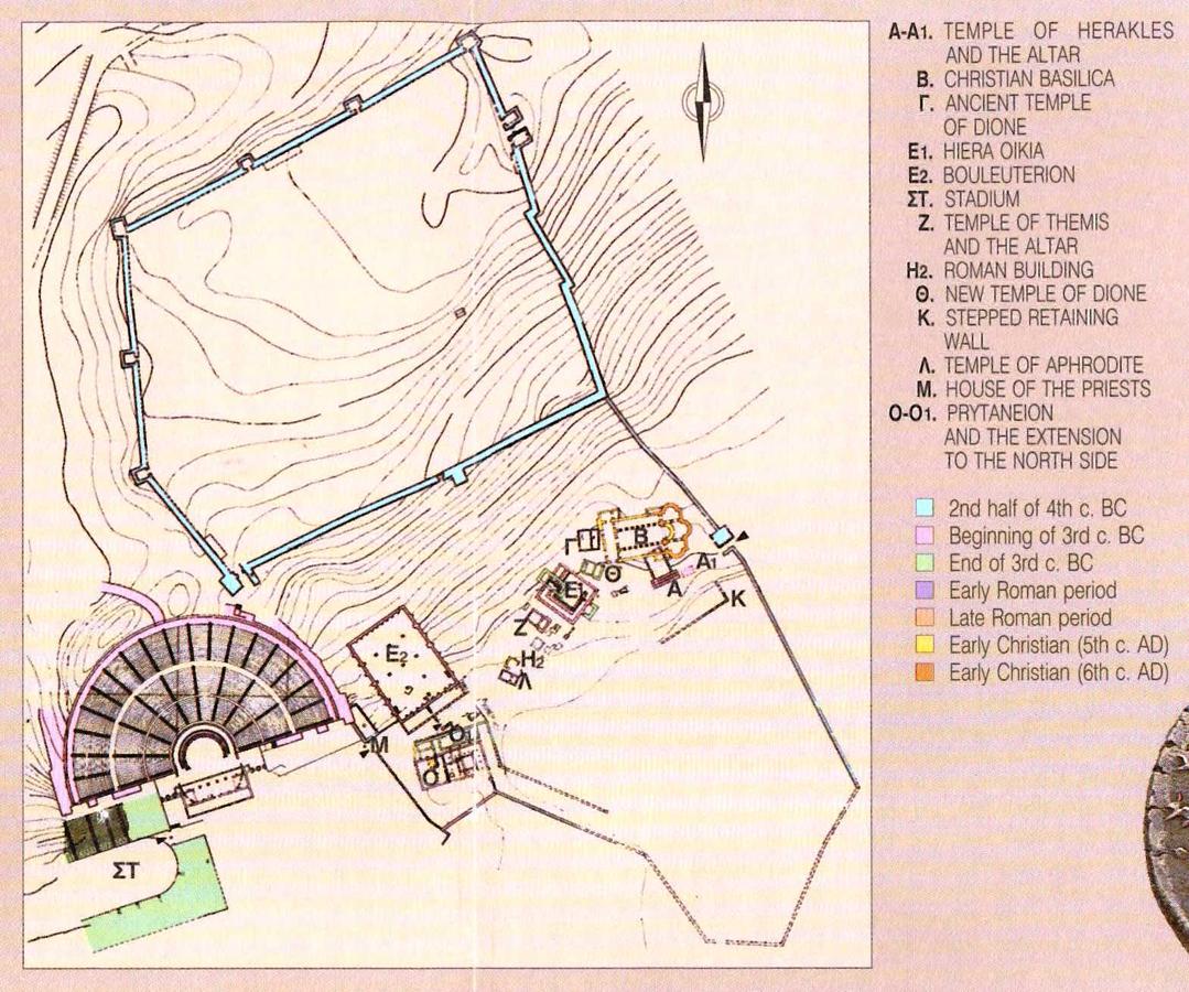 del 4° secolo AC, quando il tempio di Zeus assunse una nuova forma e furono costruiti il primo tempio di Dione, il muro di recinto e l'acropoli. Alla fine del 4° - inizio del 3° secolo AC il Tempio di Zeus fu ricostruito insieme ai templi di Themis, Afrodite ed Eracle. Il bouleuterion e il Pritaneo sono stati eretti in questo periodo, il muro di recinto del santuario è stato ampliato, e fu costruito il teatro. Nel finire del 3° secolo AC, è stato costruito lo stadio, allargato il Pritaneo, e più tardi il tempio di Dione.
