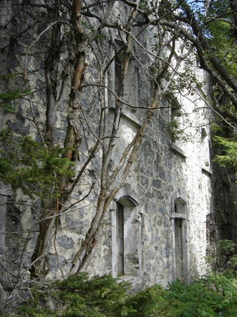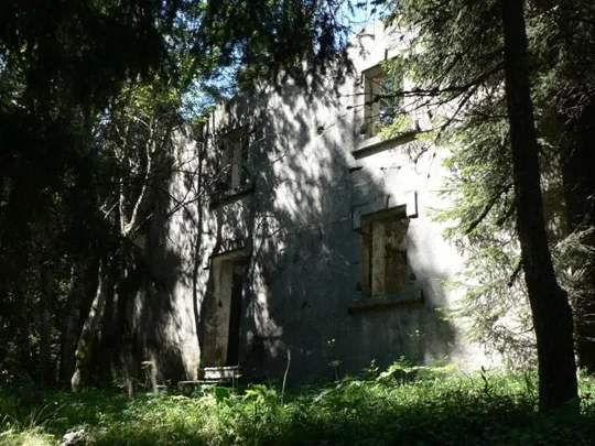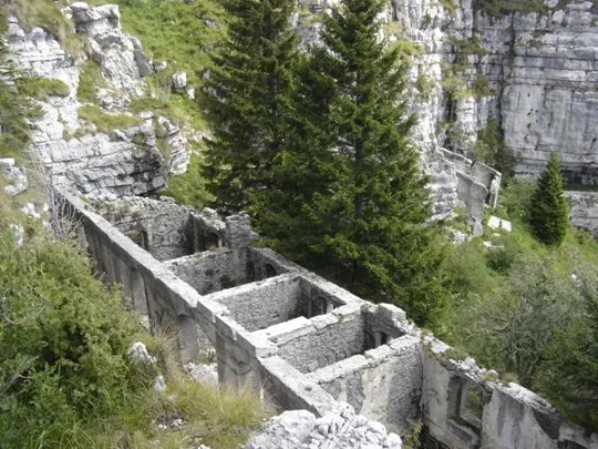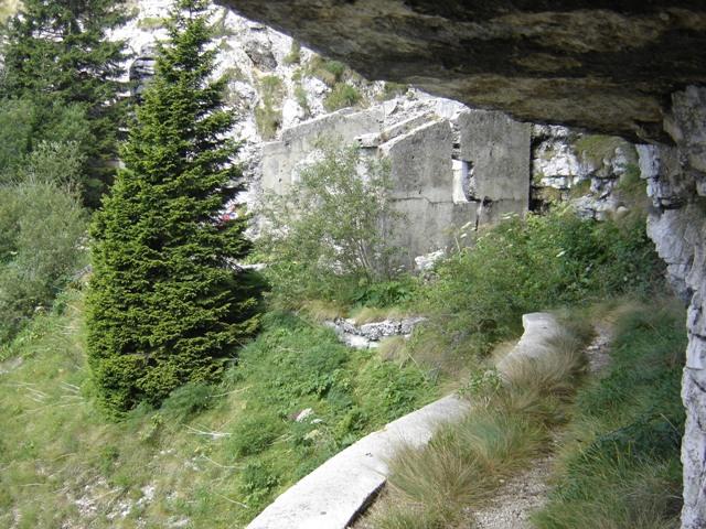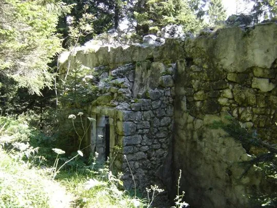 Per arrivare alla cima manca ancora poco, 500/600 mt. Dopo due tornati, in prossimità di una baita, si può scegliere se andare subito al forte (proseguendo per la strada) o visitare i resti delle caserme. Se decidete per le caserme seguite il sentiero che passa di fronte alla baita. Dopo pochi metri troverete la casa delle guardie, il primo avamposto di difesa.