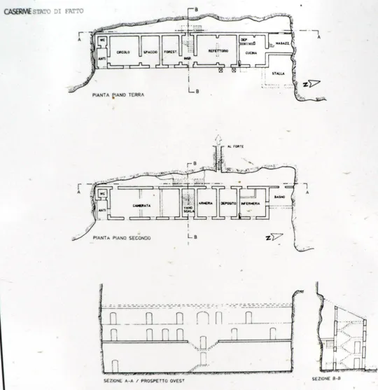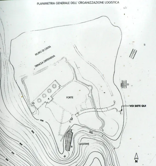 Queste cartine sono appese vicino alla galleria d'ingresso. Sulla pianta della caserma si può trovare anche un'area adibita a stalla, anche i poveri muli avevano il loro riparo.