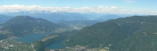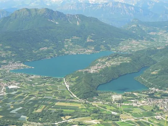 Sotto di noi, sugli specchi d'acqua di Levico e Caldonazzo, si distinguono chiaramente degli windsurf.