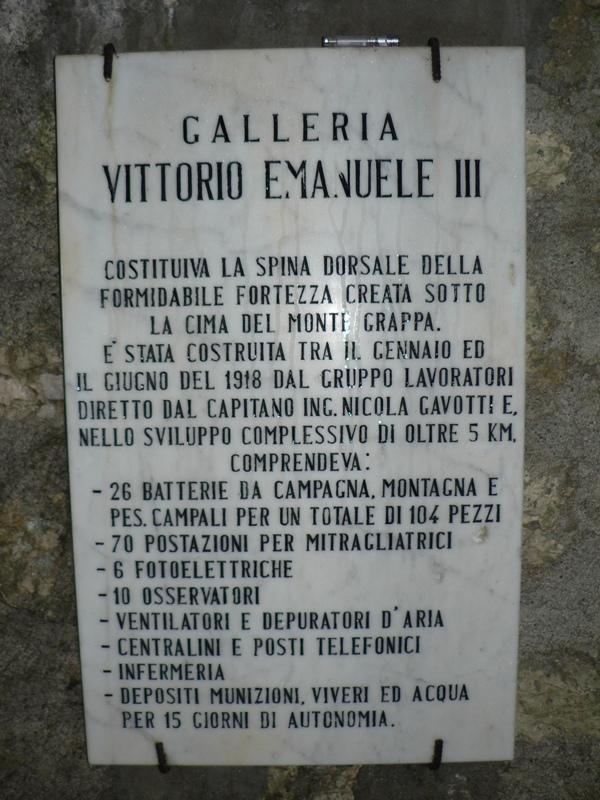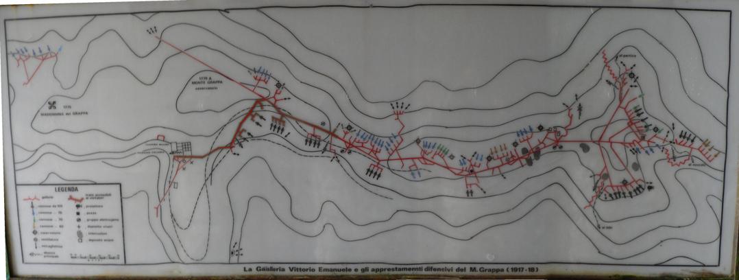 Per realizzare la galleria, ricavata al di sotto della Cima Grappa, alta m. 3 e larga da 1,80 a 2,50 m,. fu necessario asportare circa 40.000 m.c. di roccia impiegando 24 perforatrici meccaniche. Essa venne armata e dotata di impianti tecnici e logistici tali da consentire ai reparti in caverna (circa 15.000 uomini con 72 cannoni e 70 mitragliatrici) la vita ed il combattimento per lungo tempo.