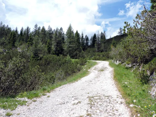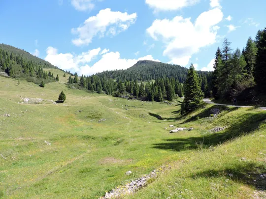 Il sentiero termina nella strada che proviene da est dal Bivio delle Saline e prosegue a nord-ovest verso il Monte Forno e Malga Pozze.