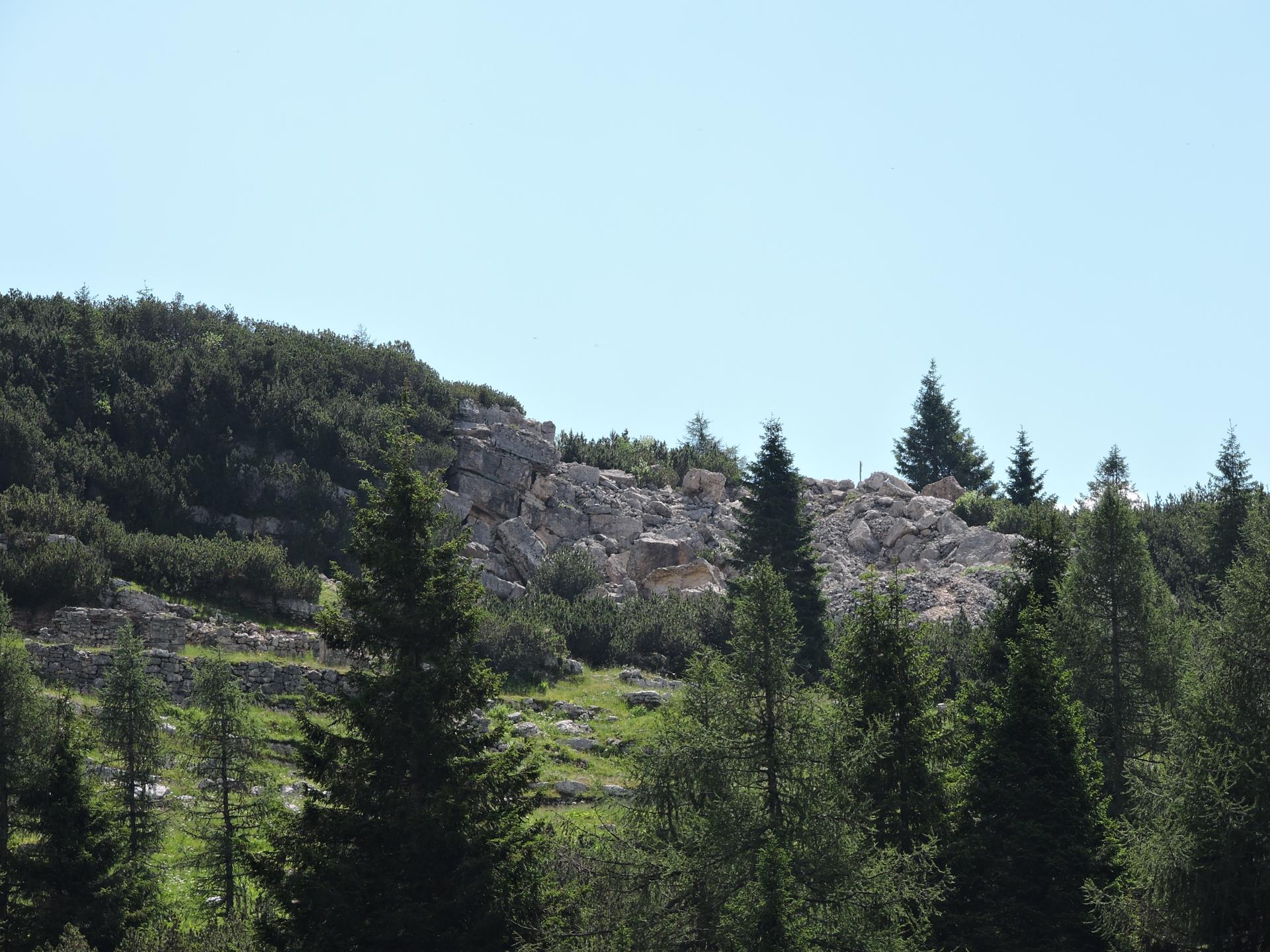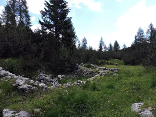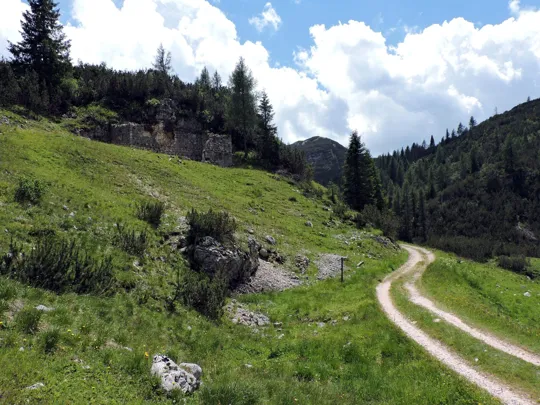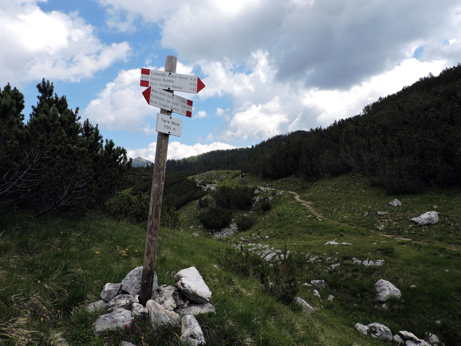 Superati alcuni ruderi della Grande Guerra si arriva al sentiero 836 che da Terre More porta a Mina della Botte.