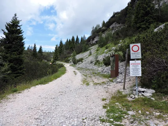 Dal parcheggio di val Galmarara, si procede verso nord in direzione del Bivio Italia. Si rimane sulla strada per 1,1 km fino ad incontrare sulla destra una strada che sale verso est. La deviazione è segnalata da questa tabella: