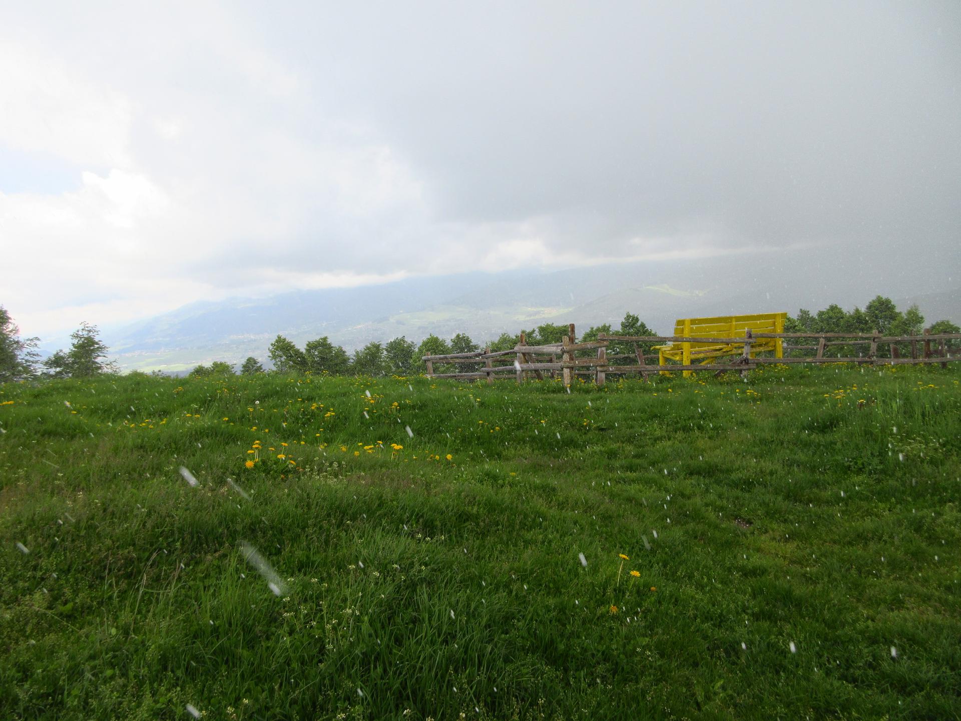 Si arriva così sulla cresta di cima Ekar e alla famosa panchina gialla. Non garantisco che troviate anche la grandine che vedete in foto!