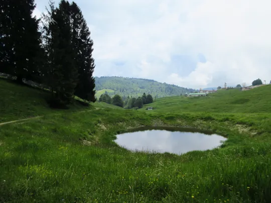 La malga è attorniata da boschi di faggio e abete rosso e si estende per 28 ettari con 4 pozze e 3 edifici di servizio.