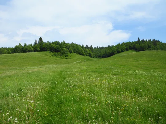 Il sentiero prosegue sull'erba svoltando a destra poco prima del reticolato che delimita la malga.