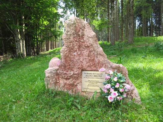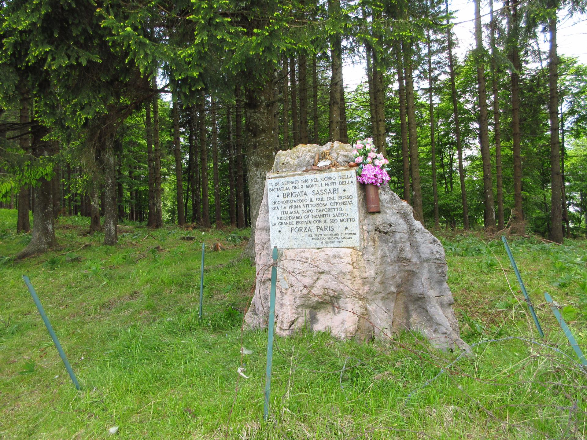 In cima al colle alcune scolorite ed illeggibili tabelle raccontano la storia della Battaglia dei Tre Monti, ma per fortuna c'è anche una nuova e leggibilissima tabella dell'Alta via della Grande Guerra che riporto nella sezione "Storia" a fondo pagina. Un paio di monumenti completano la memoria di questo luogo di battaglia.