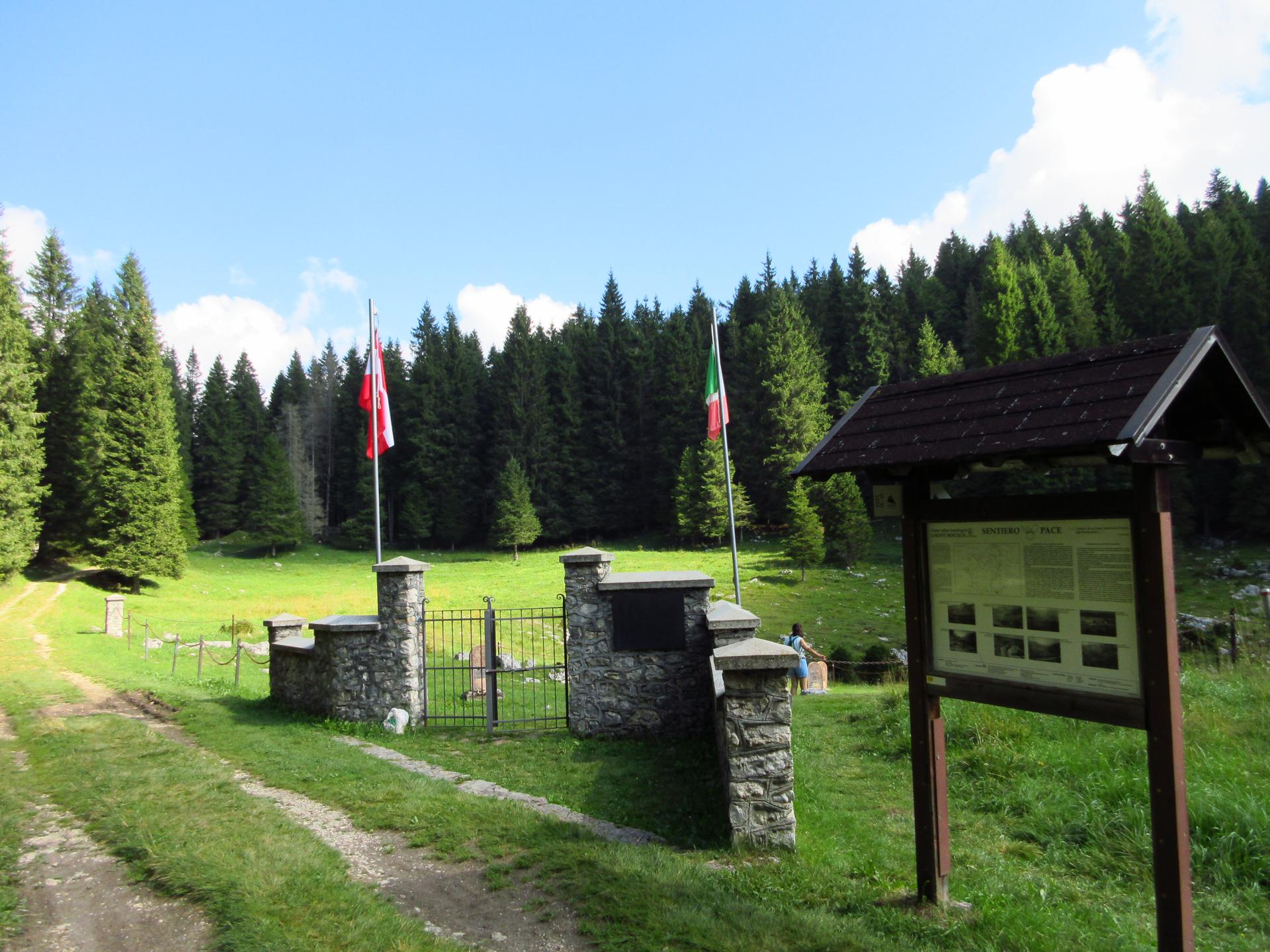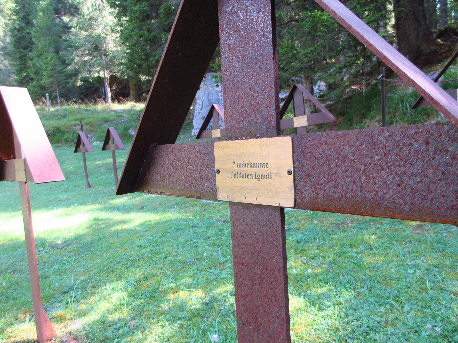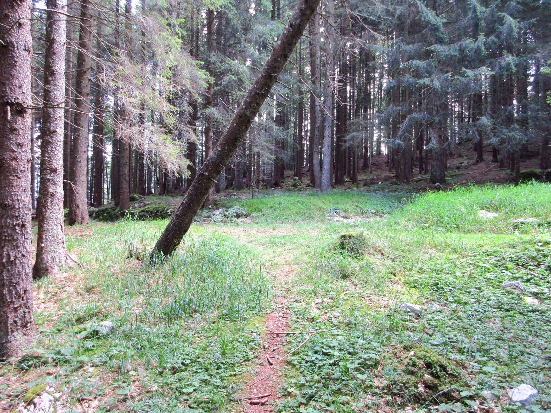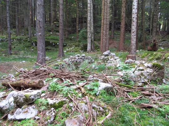 Si scende e si prende il sentiero verso destra. Il sentiero termina nella valle dello Zemblen. Nel secolo scorso in quest'area ho rinvenuto e consegnato ai Carabinieri diverse spolette ed un proiettile inesploso, probabilmente un 149, ma anche diverso scatolame ed i resti di un sacco di cordite per cannoni. Tracce indissolubili della Grande Guerra.