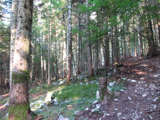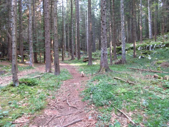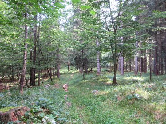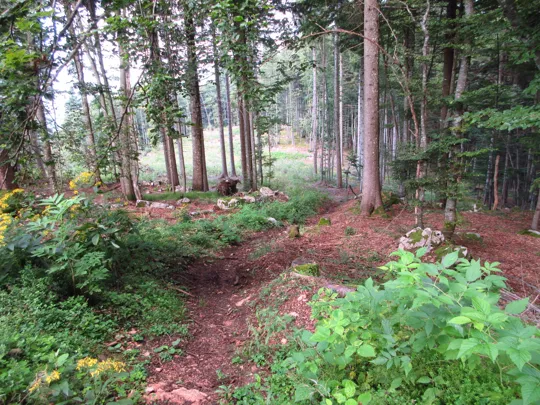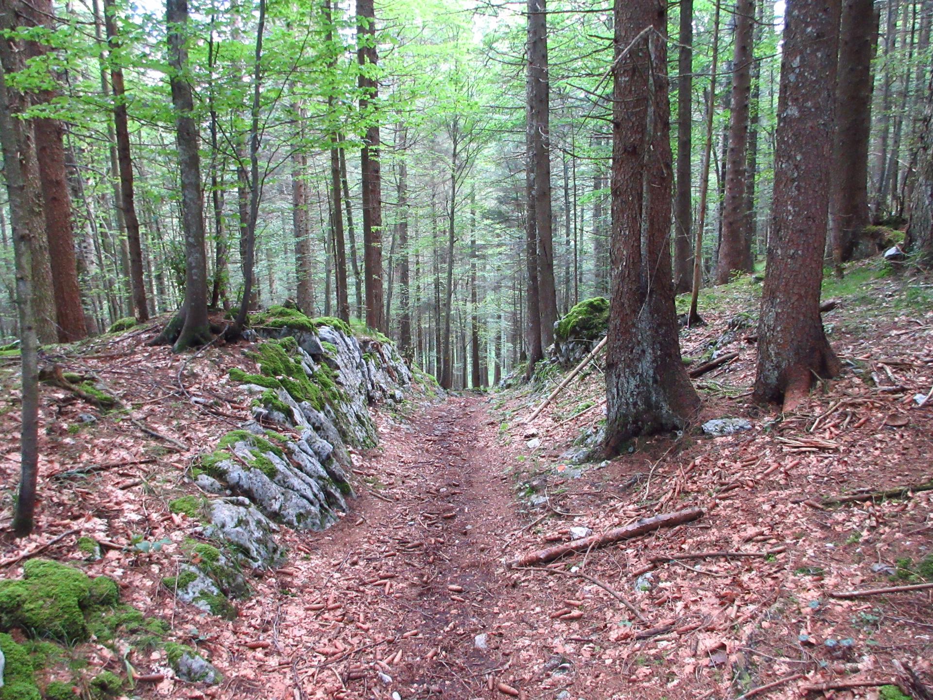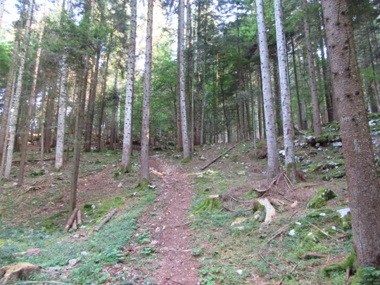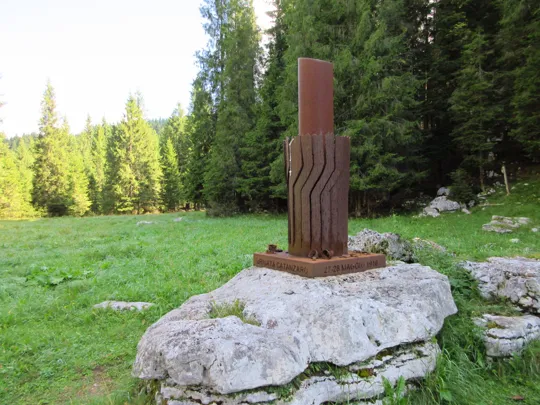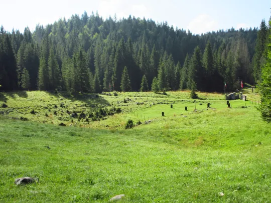 Si scende e si prende il sentiero verso destra. Il sentiero termina nella valle dello Zemblen. Nel secolo scorso in quest'area ho rinvenuto e consegnato ai Carabinieri diverse spolette ed un proiettile inesploso, probabilmente un 149, ma anche diverso scatolame ed i resti di un sacco di cordite per cannoni. Tracce indissolubili della Grande Guerra.