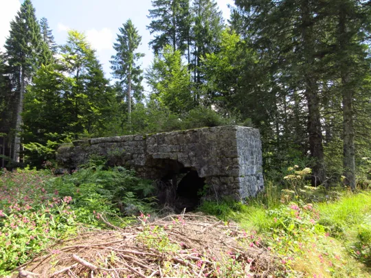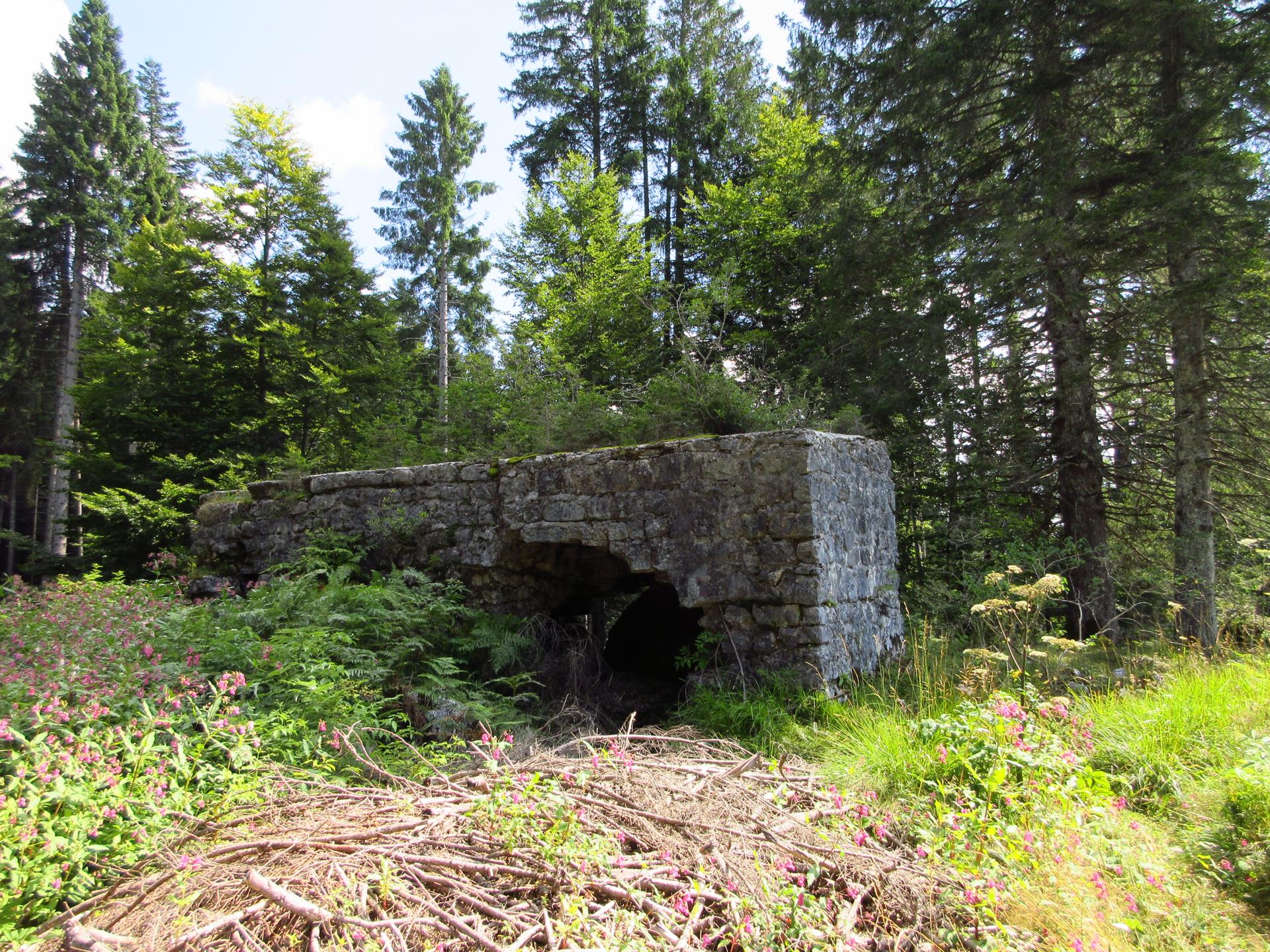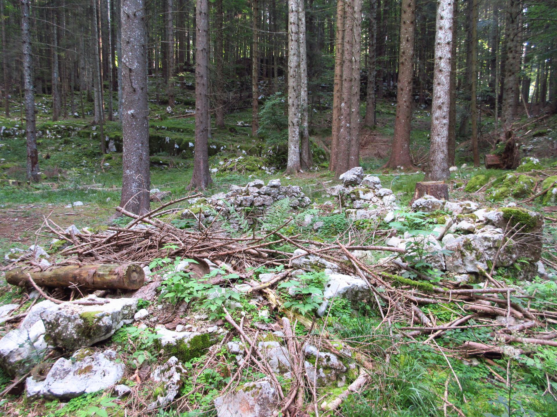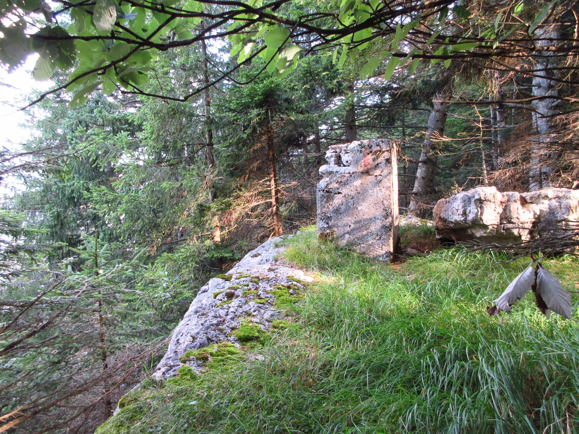 Si raggiunge una piccola radura con dei ruderi sulla destra e sulla sinistra, alle pendici del monte, una strana costruzione, forse un segnale confinale.