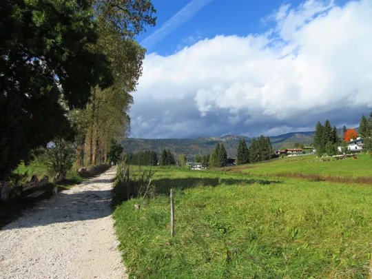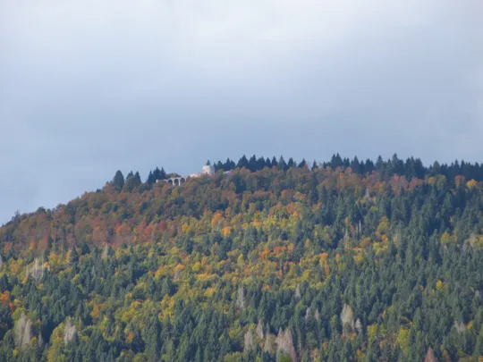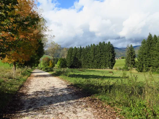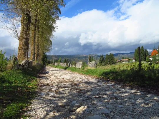 Se all'andata lo sguardo era tra prati, il Forte Interrotto, il monte Mosciagh e lo Zebio, la strada del ritorno non è da meno sulla vista del sacrario e del duomo.