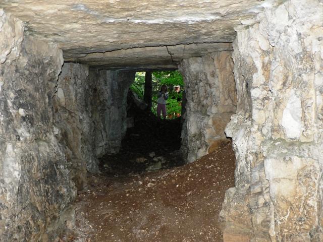 Intorno alla cima altri rifugi e postazioni. Tentando una scorciatoia tra il bosco, con la brutta esperienza di una scivolata che quasi mi slogava un ginocchio, abbiamo rinvenuto un'altra grotta, rinforzata da una copertura in cemento armato, con due ingressi e molto ampia all'interno. Forse un deposito munizioni.