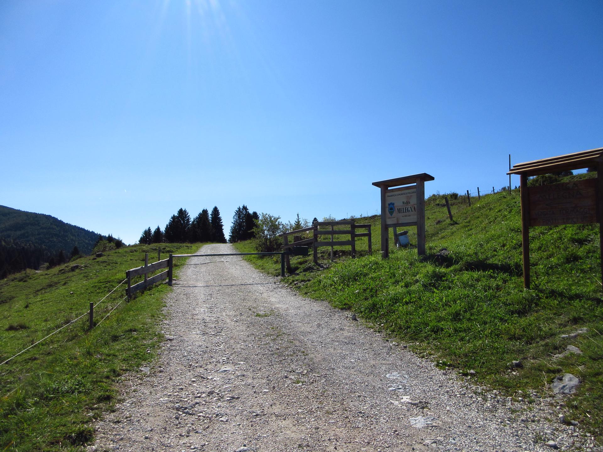 Nei pressi di Malga Melegna Zonta si continua dritti in direzione sud-ovest. La strada prosegue in costante salita, passando accanto ai resti di un ex cimitero militare, testimonianza della presenza bellica su queste montagne.