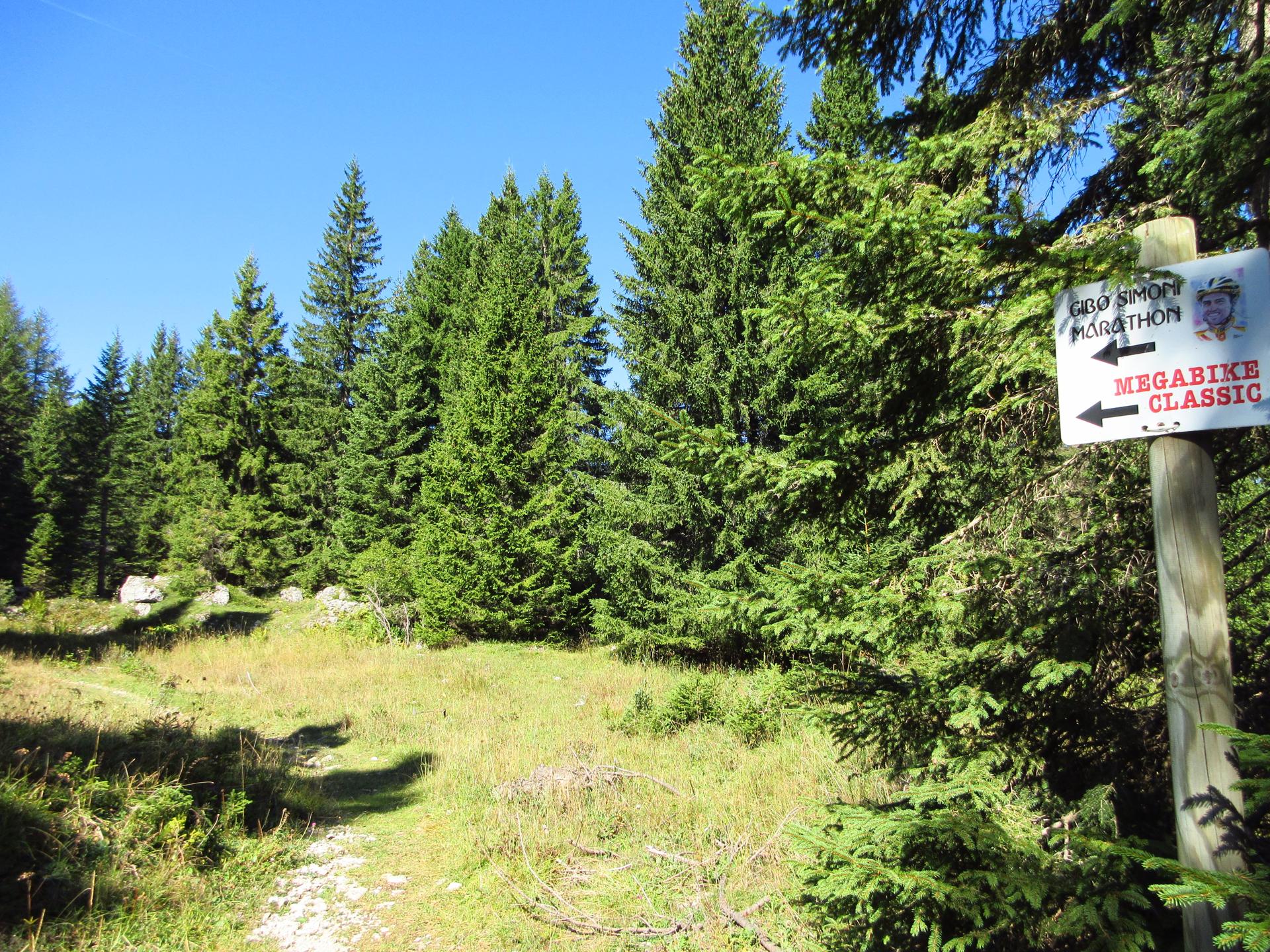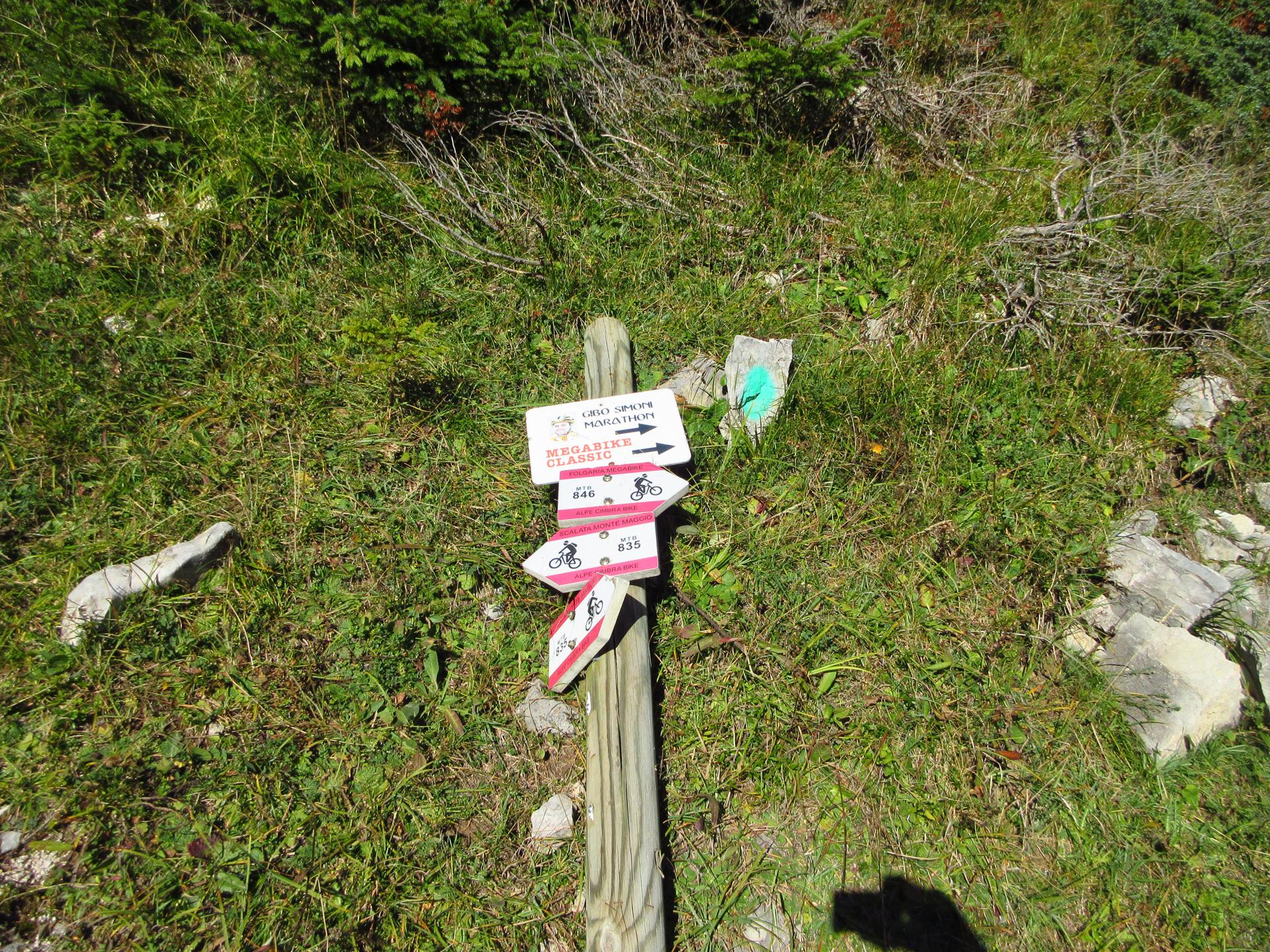 La strada prosegue attraversando prati e brevi tratti di bosco, alternando leggere salite e comodi falsopiani. Superato il primo tornante e dopo circa cinquanta metri, si abbandona la strada principale che porta direttamente al Monte Maggio per imboccare il sentiero sulla destra, più ripido fin dai primi metri. Una tabella, purtroppo caduta a terra, segnala il percorso “Gibo Simoni Marathon – Megabike Classic”.
