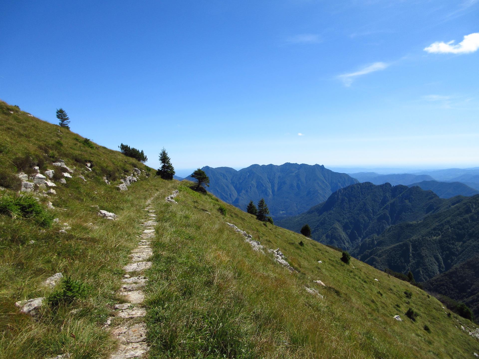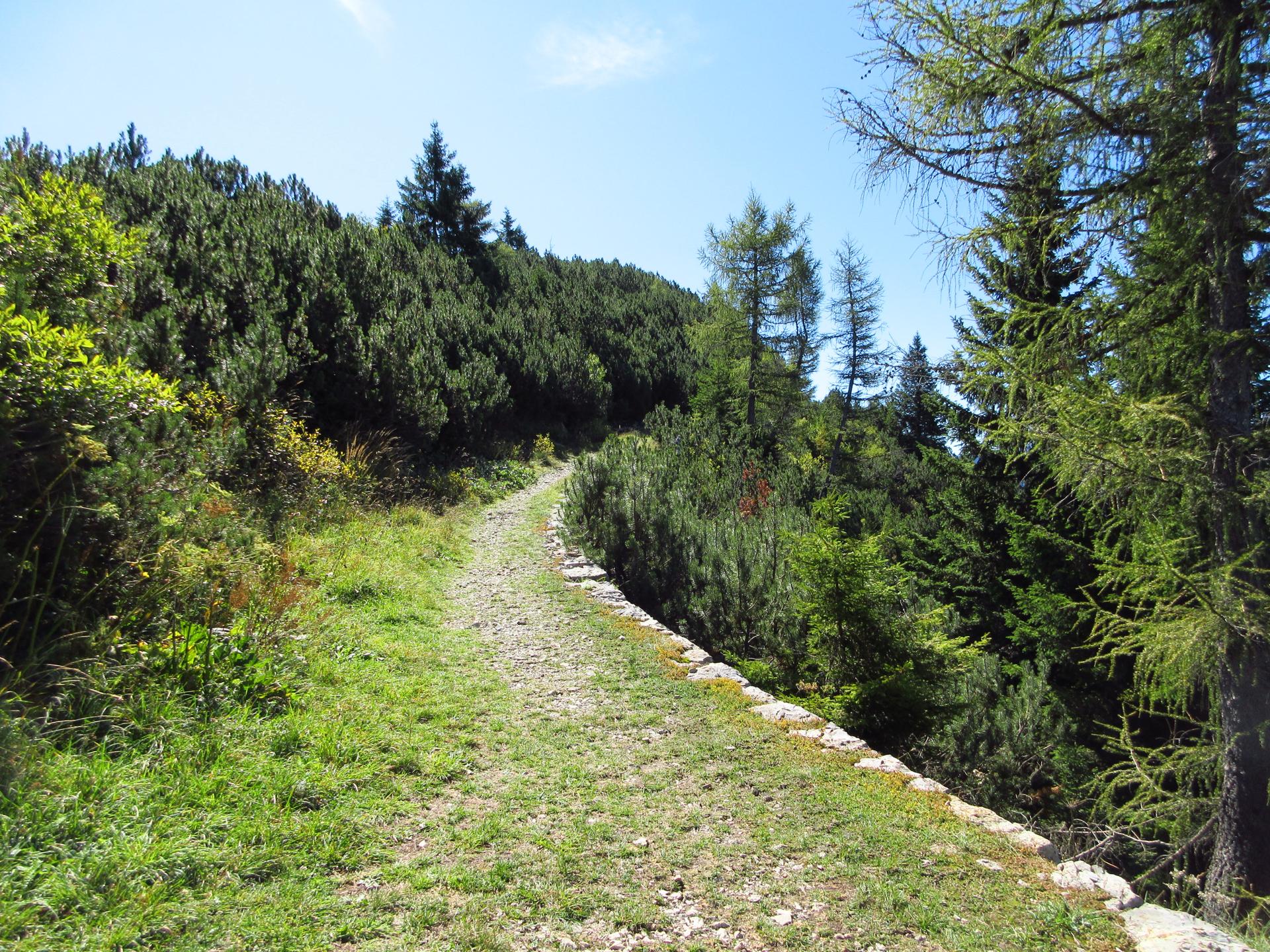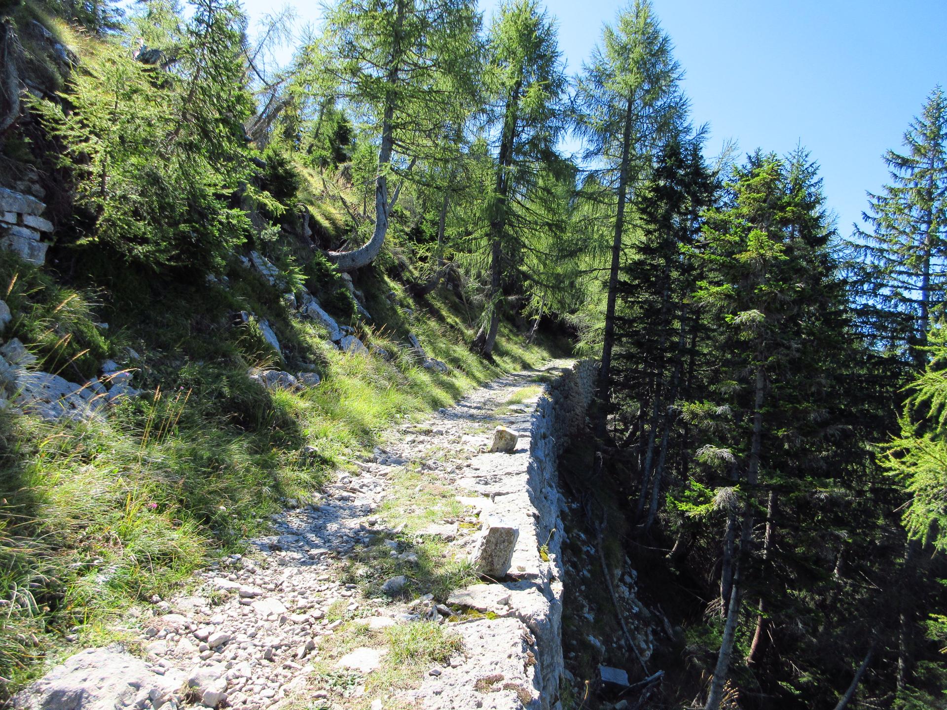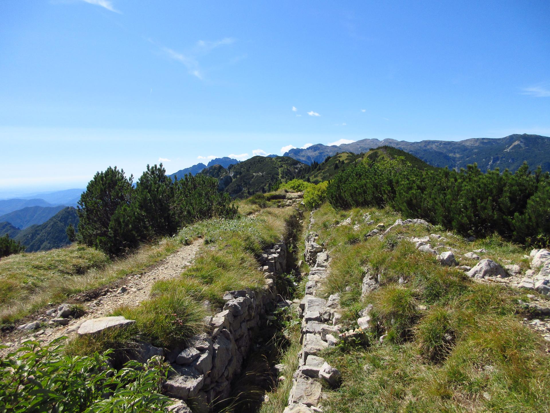 Dopo un paio di tornanti e dopo aver superato un secondo piccolo ex cimitero militare, il sentiero raggiunge la dorsale della montagna. Si oltrepassa il breve valico e si continua per poco in leggera discesa sul versante opposto.