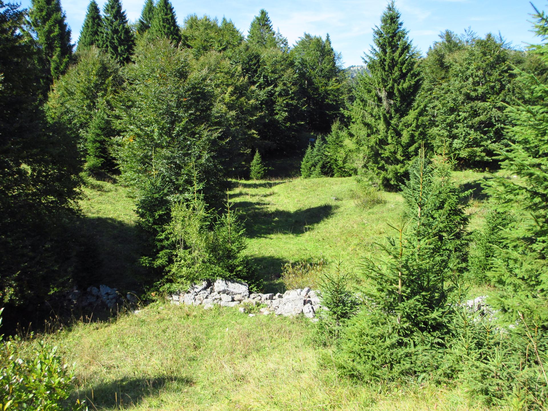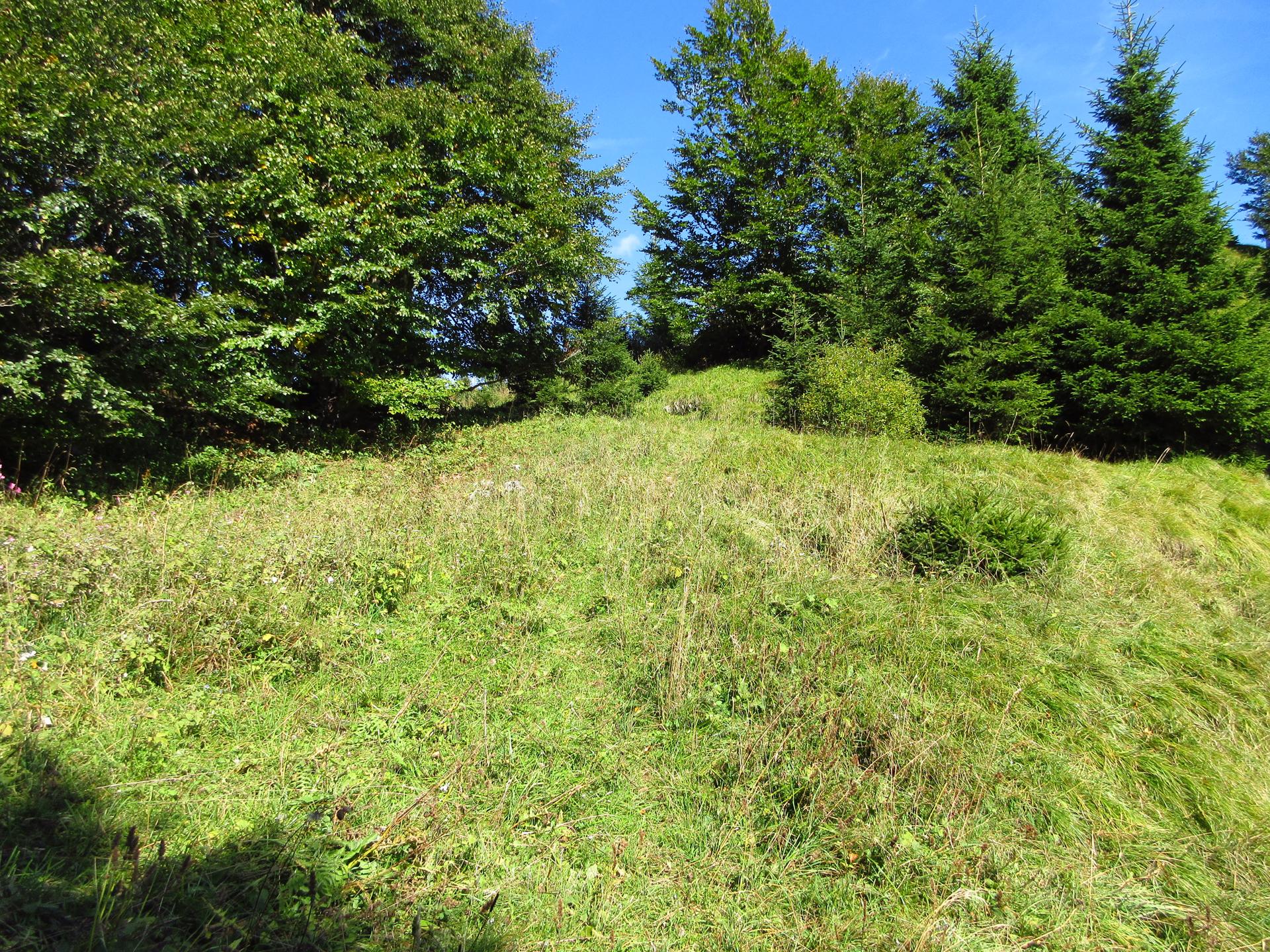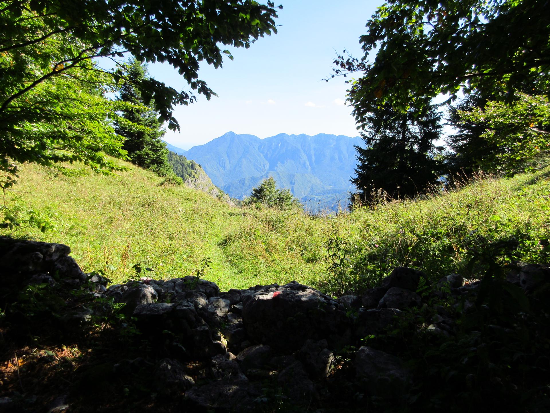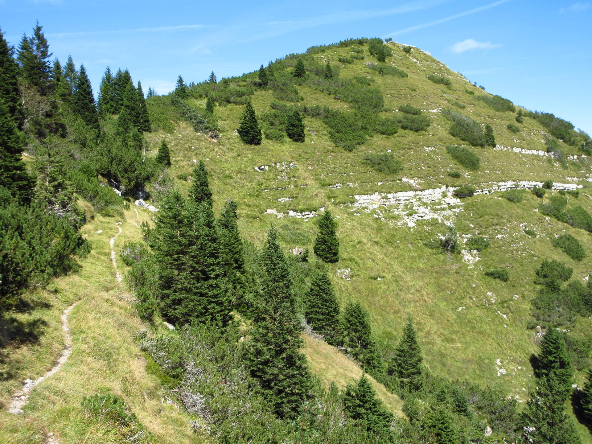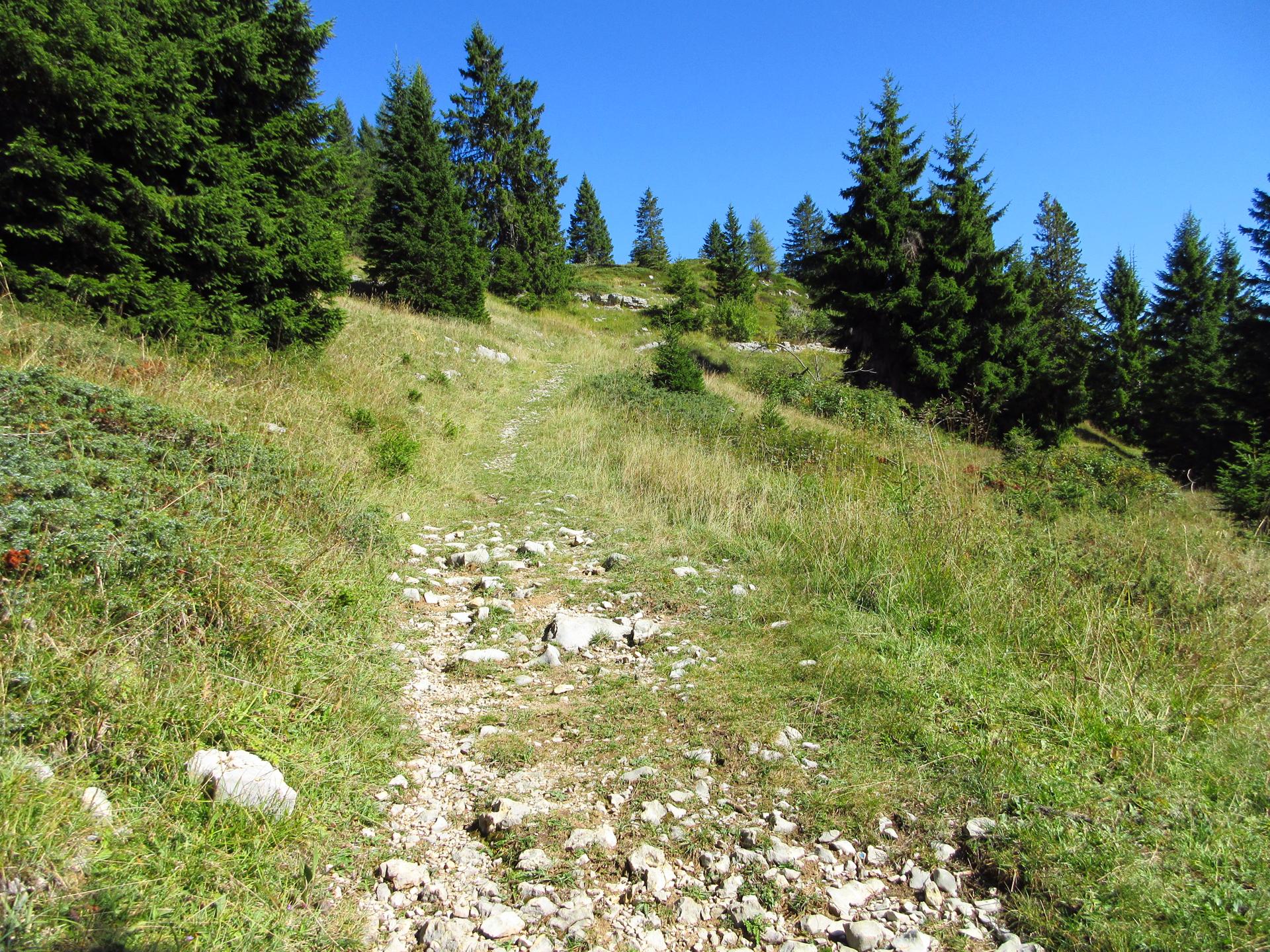 Dopo un paio di tornanti e dopo aver superato un secondo piccolo ex cimitero militare, il sentiero raggiunge la dorsale della montagna. Si oltrepassa il breve valico e si continua per poco in leggera discesa sul versante opposto.
