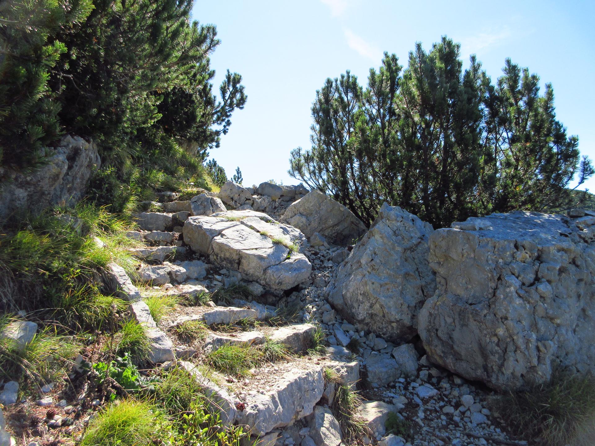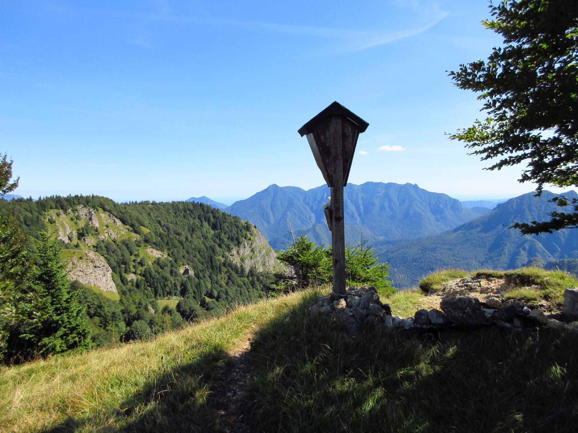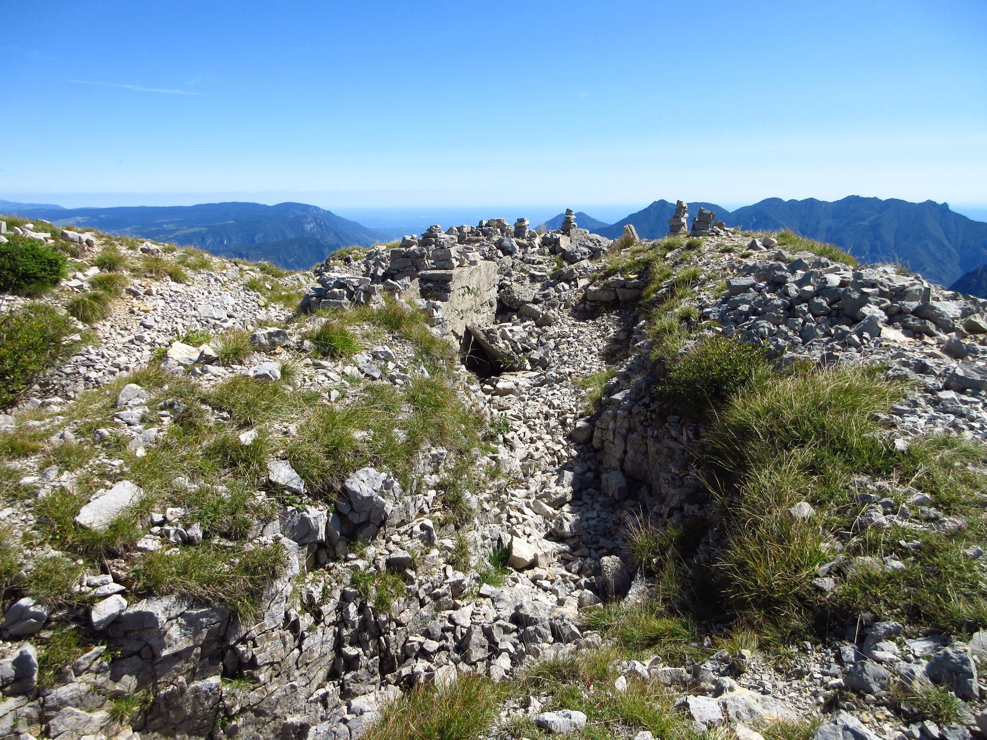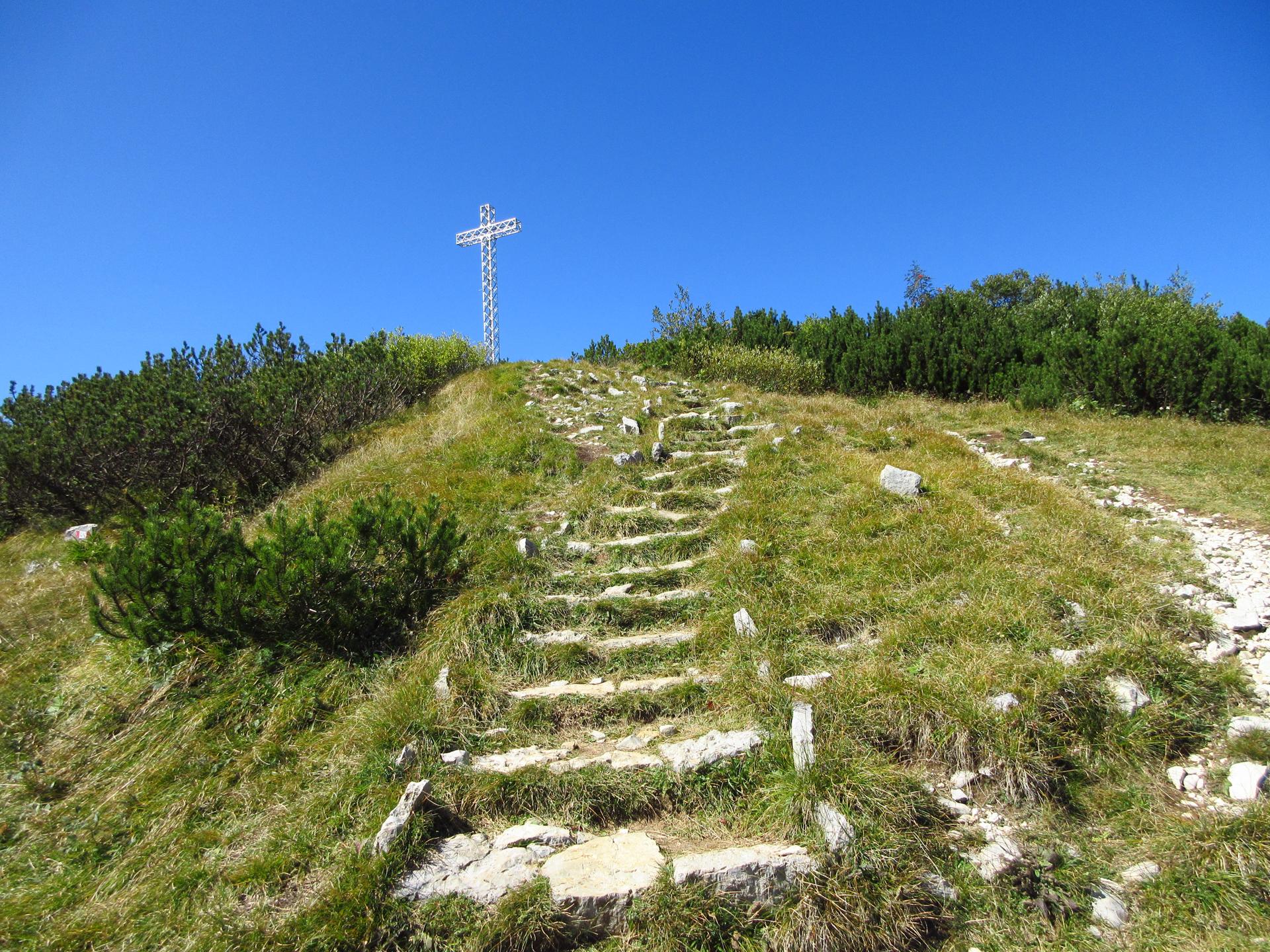 Da qui, in pochi minuti si raggiungono i pressi della cima del monte, dove resistono ancora alcuni manufatti e trincee militari. Il punto più caratteristico è però la scalinata che conduce alla croce di vetta.