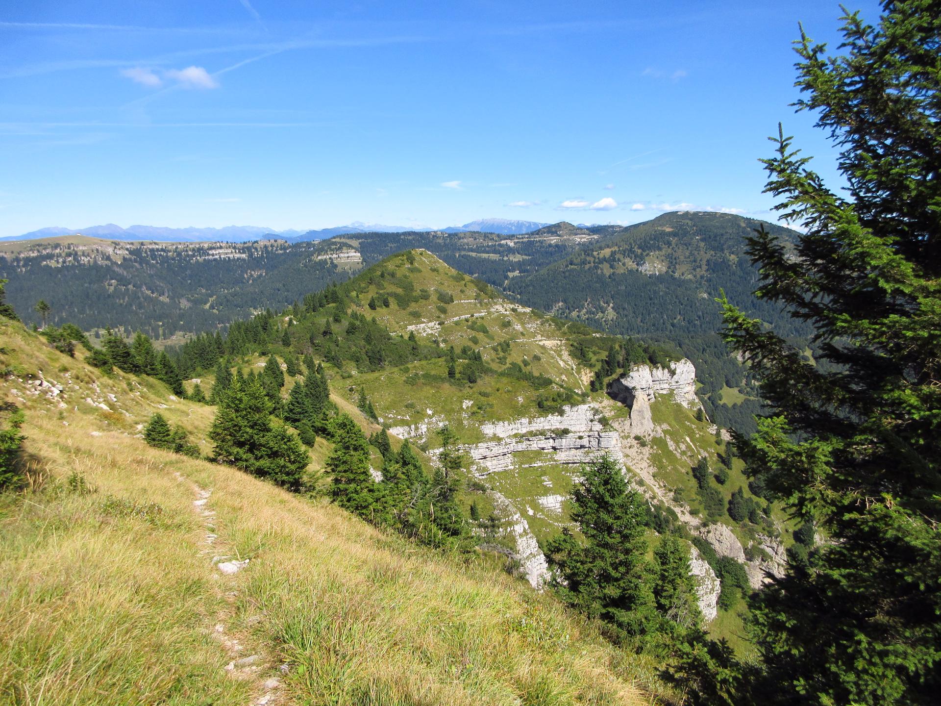 Sulla cima, altre trincee segnano ancora il terreno, memoria silenziosa della guerra. Ma è difficile soffermarsi a lungo su quei pensieri: l’incanto del panorama domina tutto. Davanti si apre un 360° di pura bellezza, con le cime del Trentino e dell’Altipiano che si susseguono senza fine.