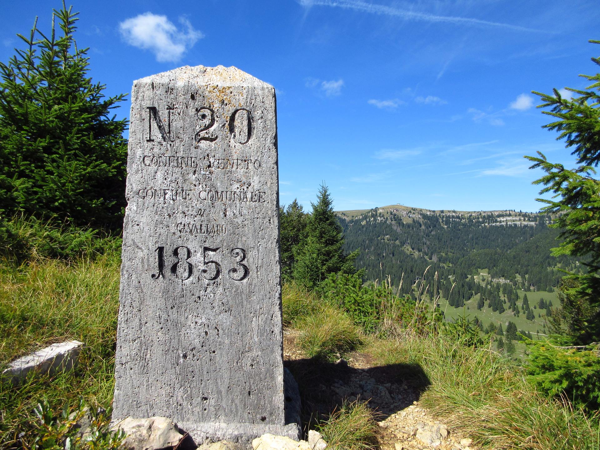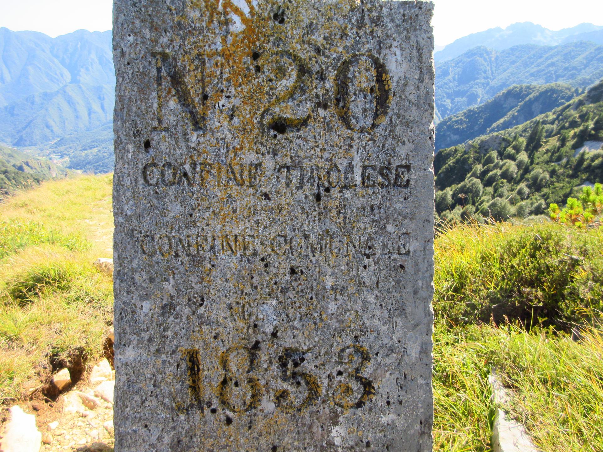 Qui il sentiero si fa molto più stretto ed esposto sulla ripida discesa verso valle. Prosegue in lieve traverso fino a raggiungere un antico cippo di confine del 1853, che segnava il limite tra Veneto e Tirolo.