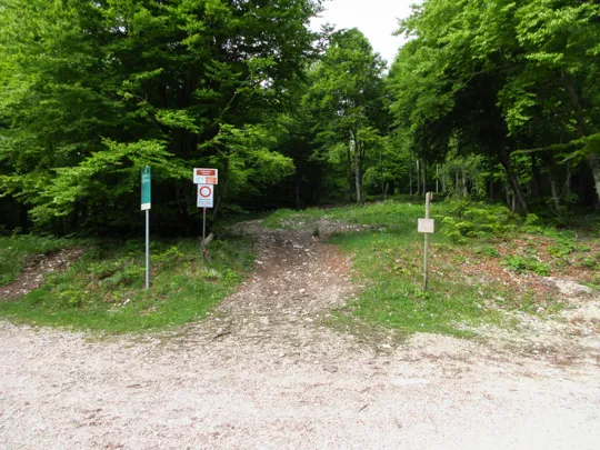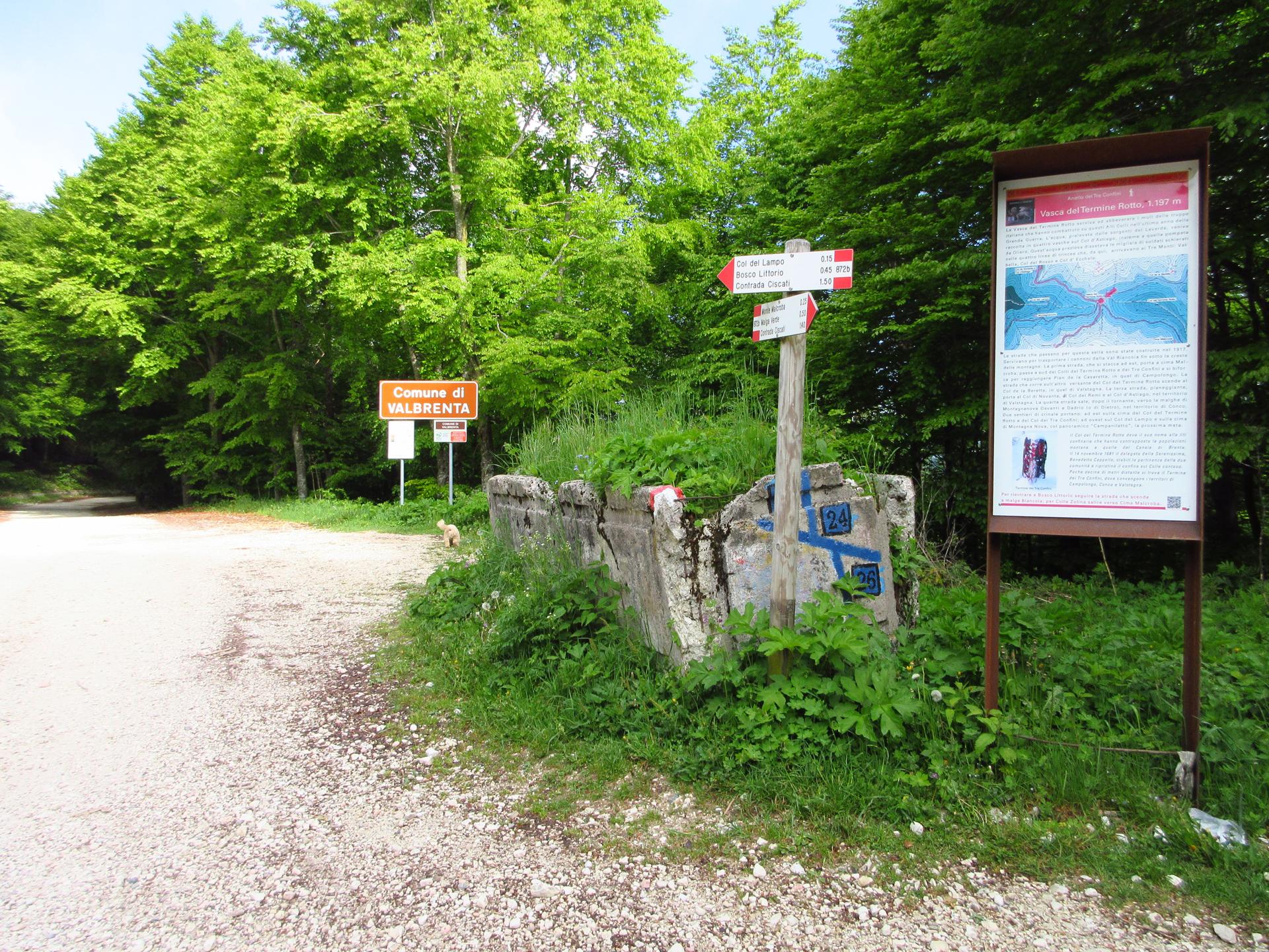 Il percorso inizia in direzione sud sul sentiero di fronte alla vasca del Termine Rotto. L'indicazione è per il sentiero 872b ed in questo punto la tabella riporta "Anello dei Tre Confini".