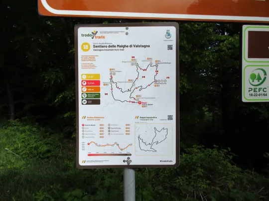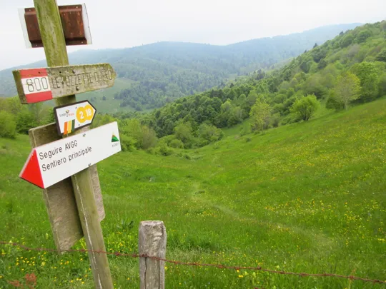 Superata la malga, quando la strada fa una svolta a sinistra, si trovano le indicazioni per proseguire lungo il sentiero 800.