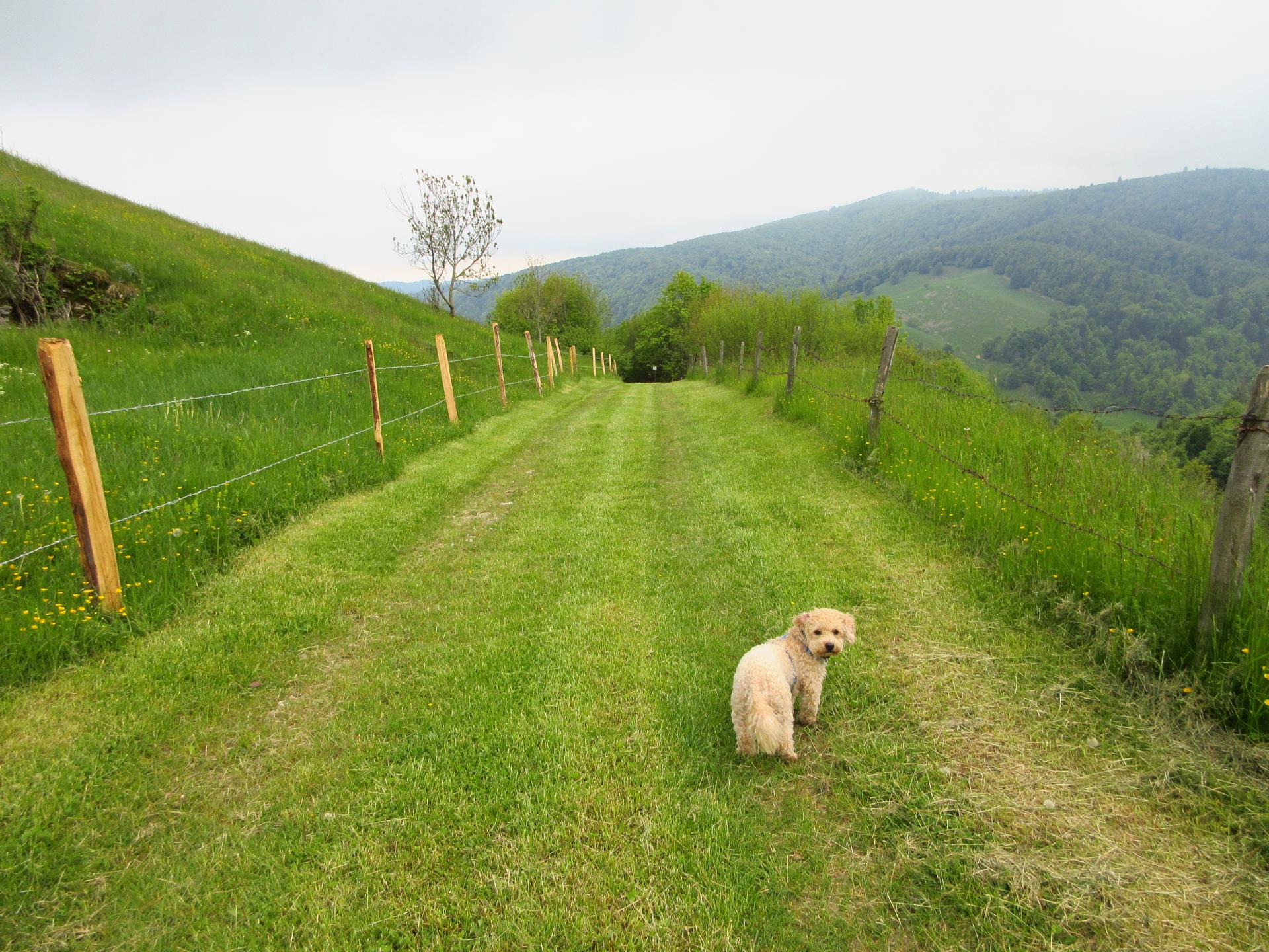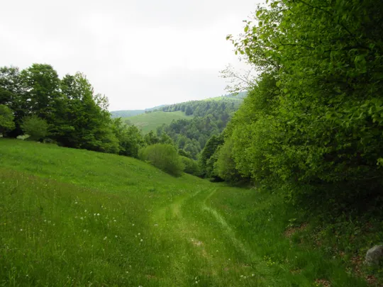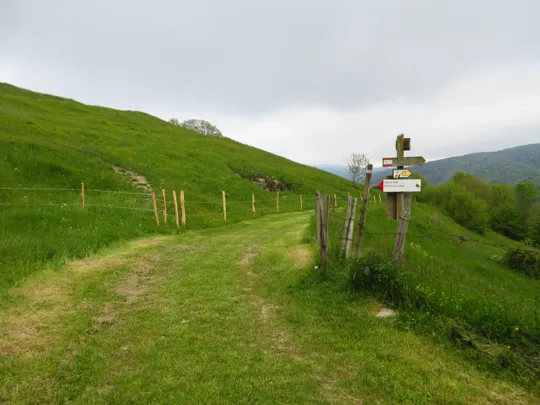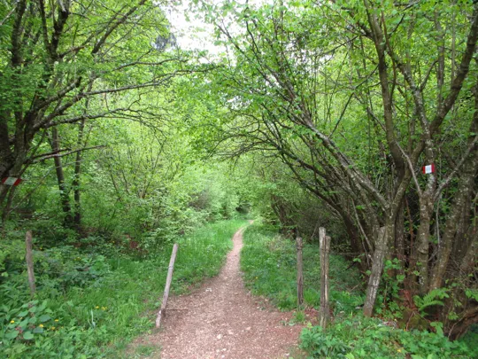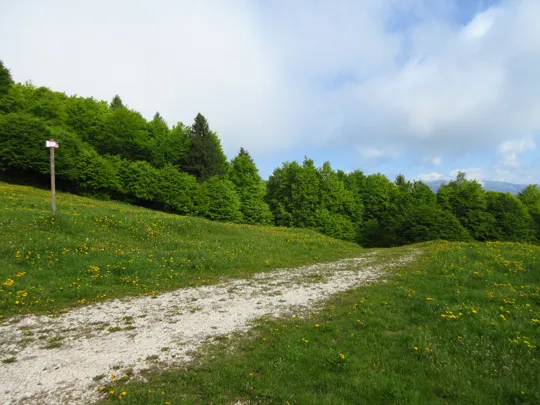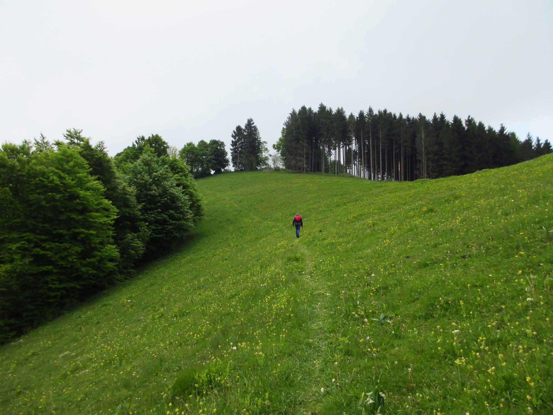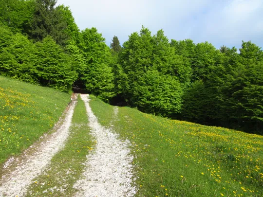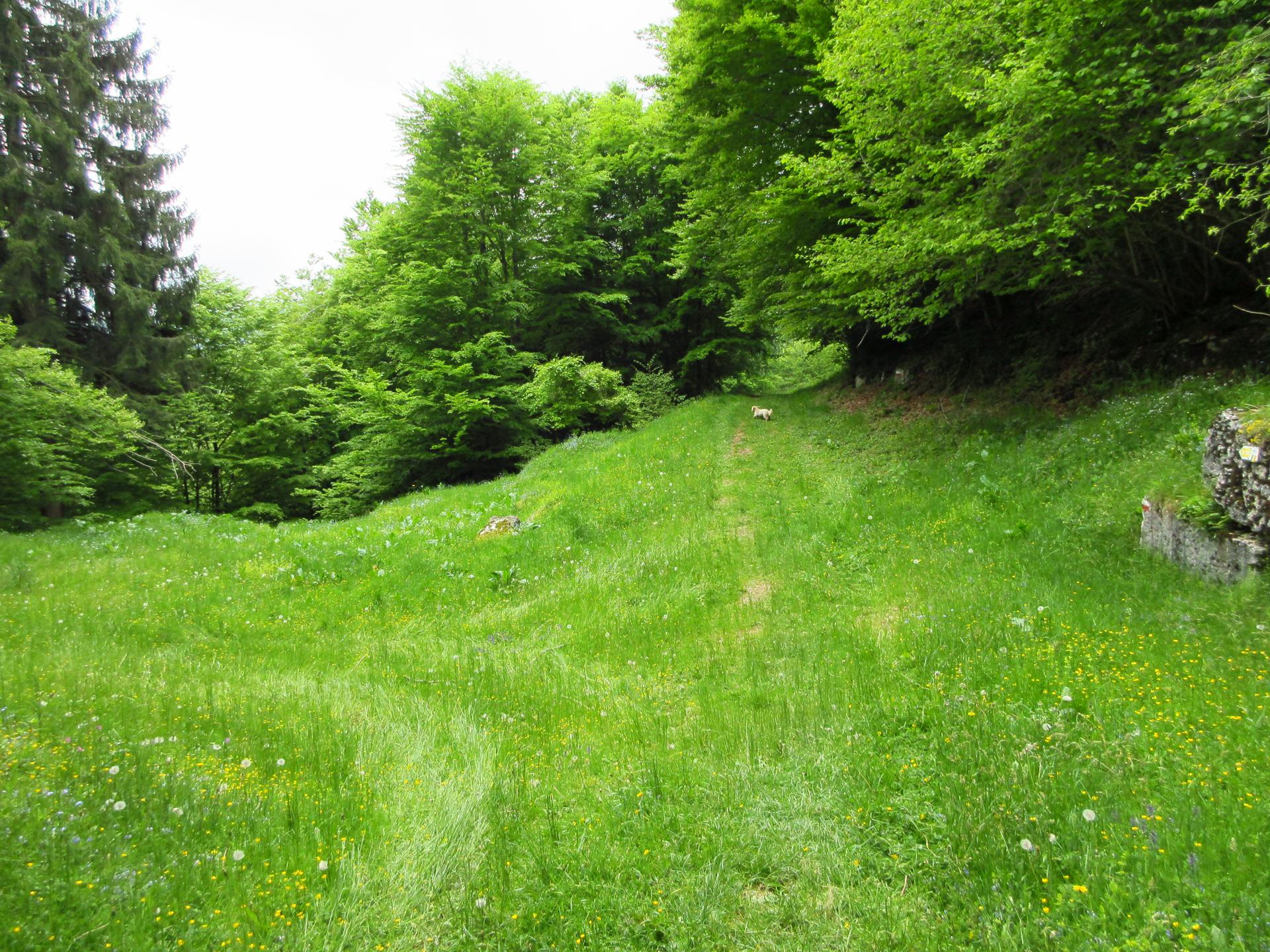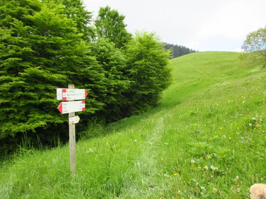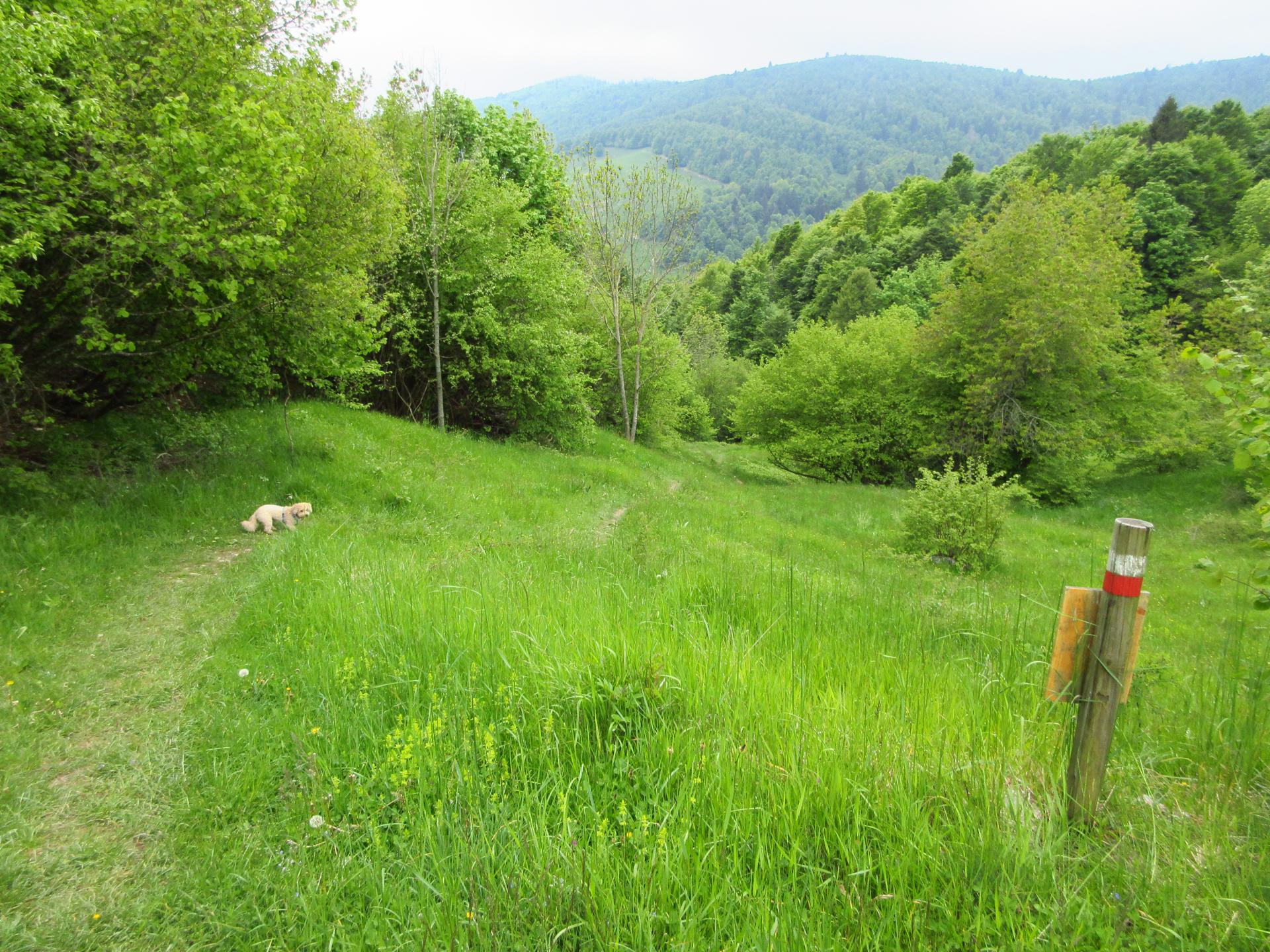 La tabella indica di lasciare la strada e scendere lungo il prato. Con l'erba scivolosa noi abbiamo proseguito lungo la strada dove l'erba era stata recentemente tagliata. Qui si raggiunge una "postazione di caccia" e poco prima della postazione si gira a destra per ritrovare subito il sentiero, evitando così un parte della ripida discesa erbosa.