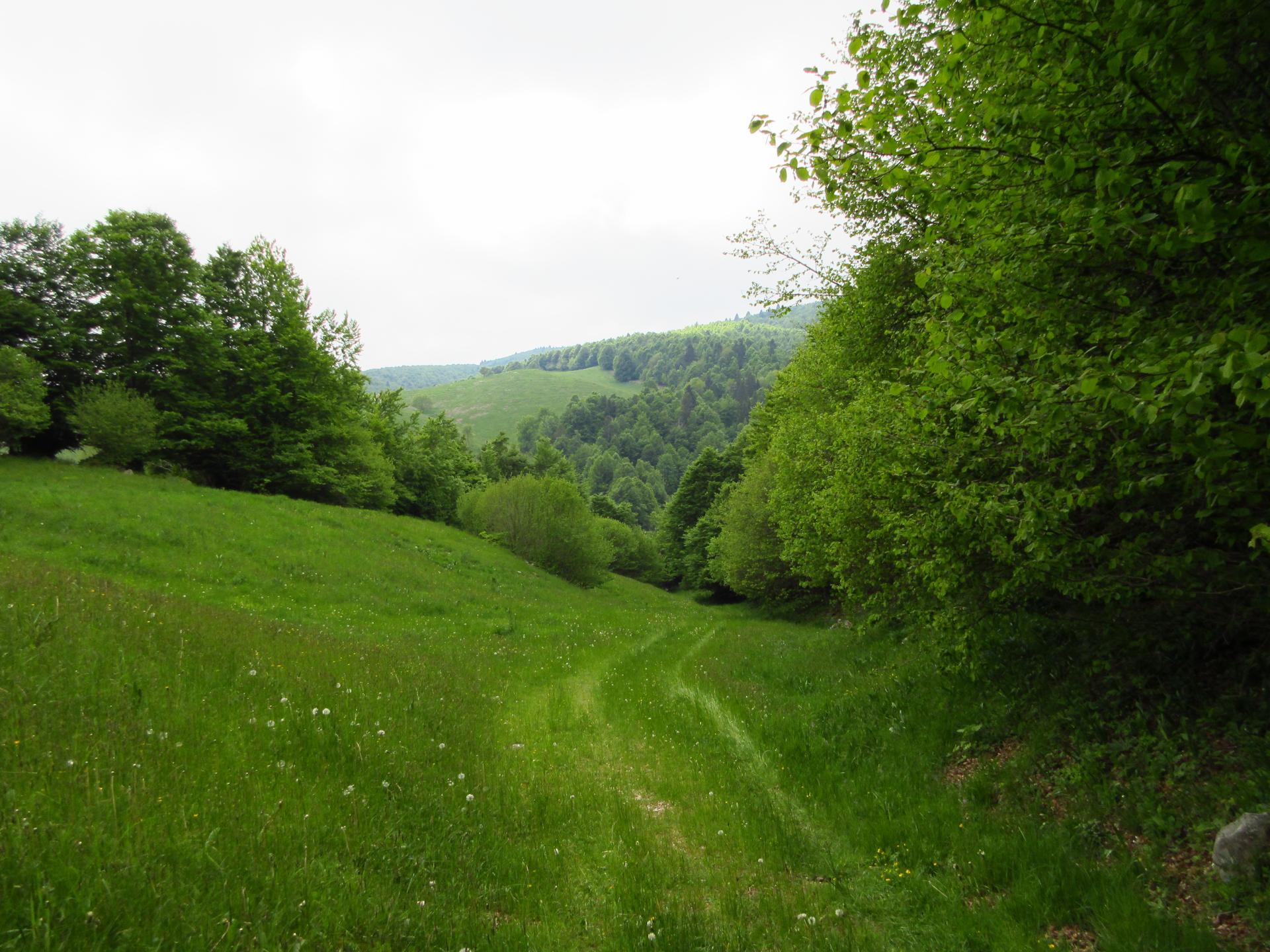 Ridiscesi dalla malga si prosegue verso sud lungo la strada che attraversa la piccola vallata.