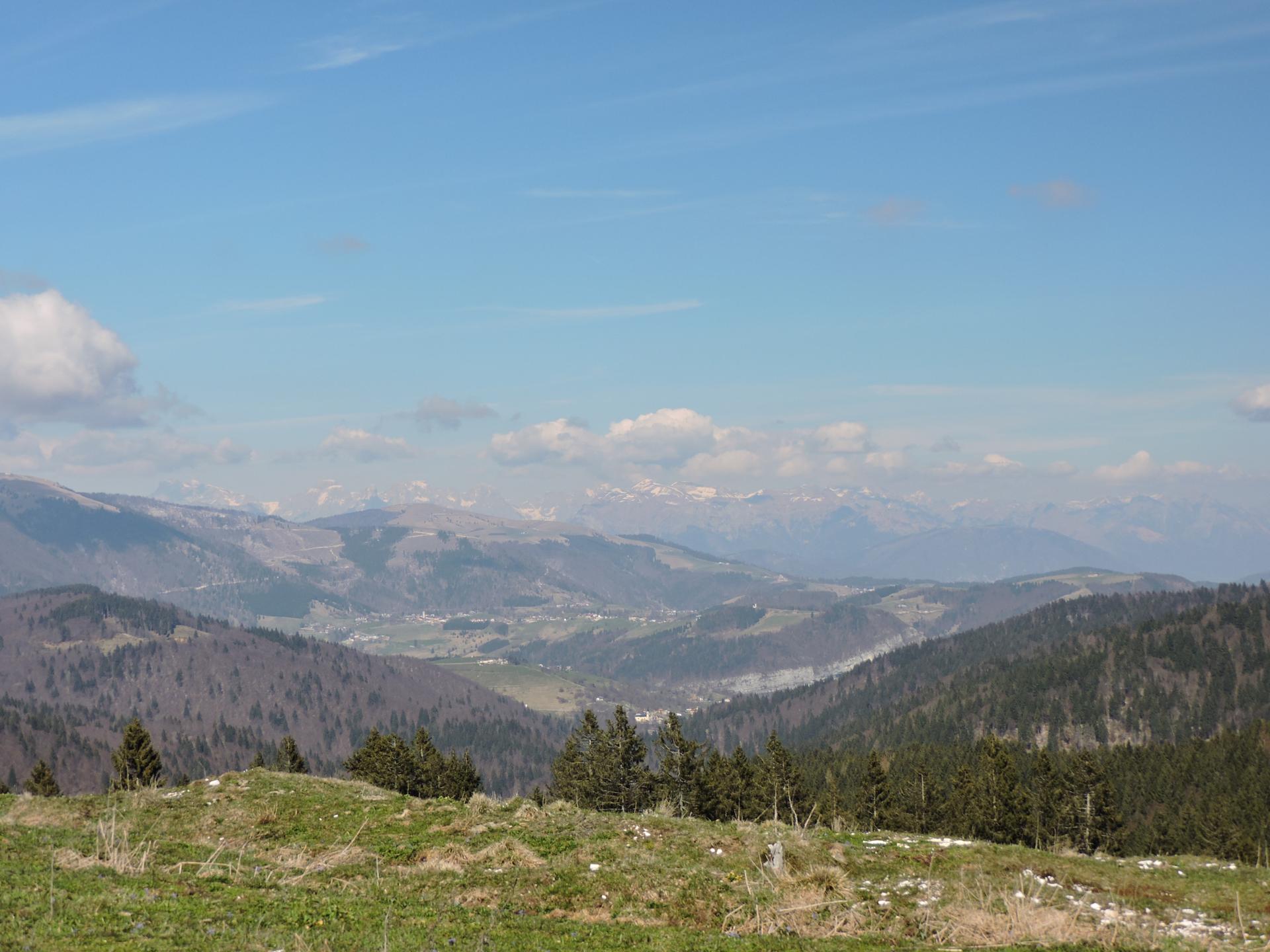 A sud la pianura, a est il massiccio del Grappa, a nord il Lagorai e in lontananza le Pale di San Martino.