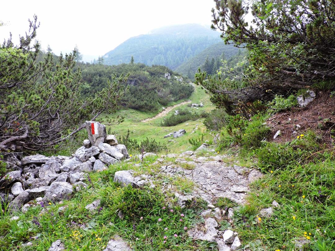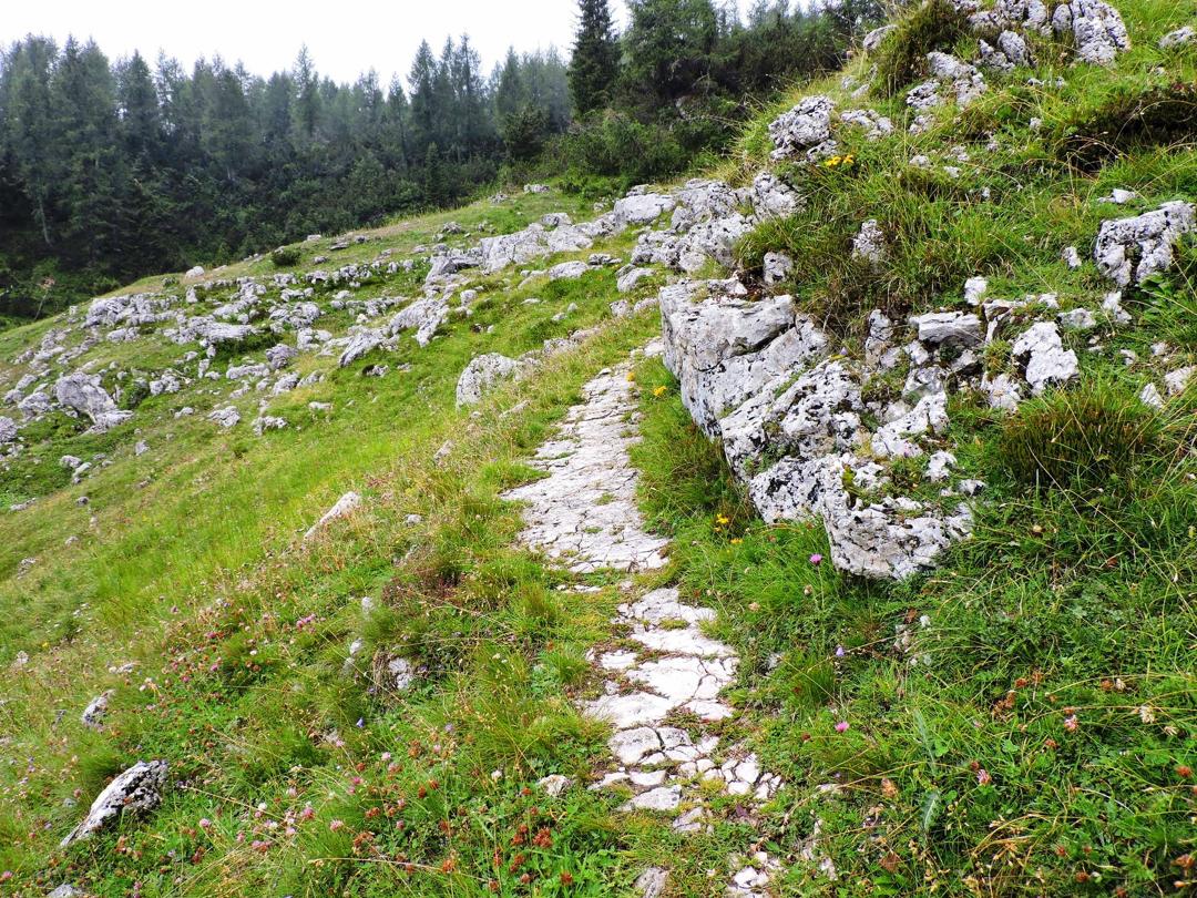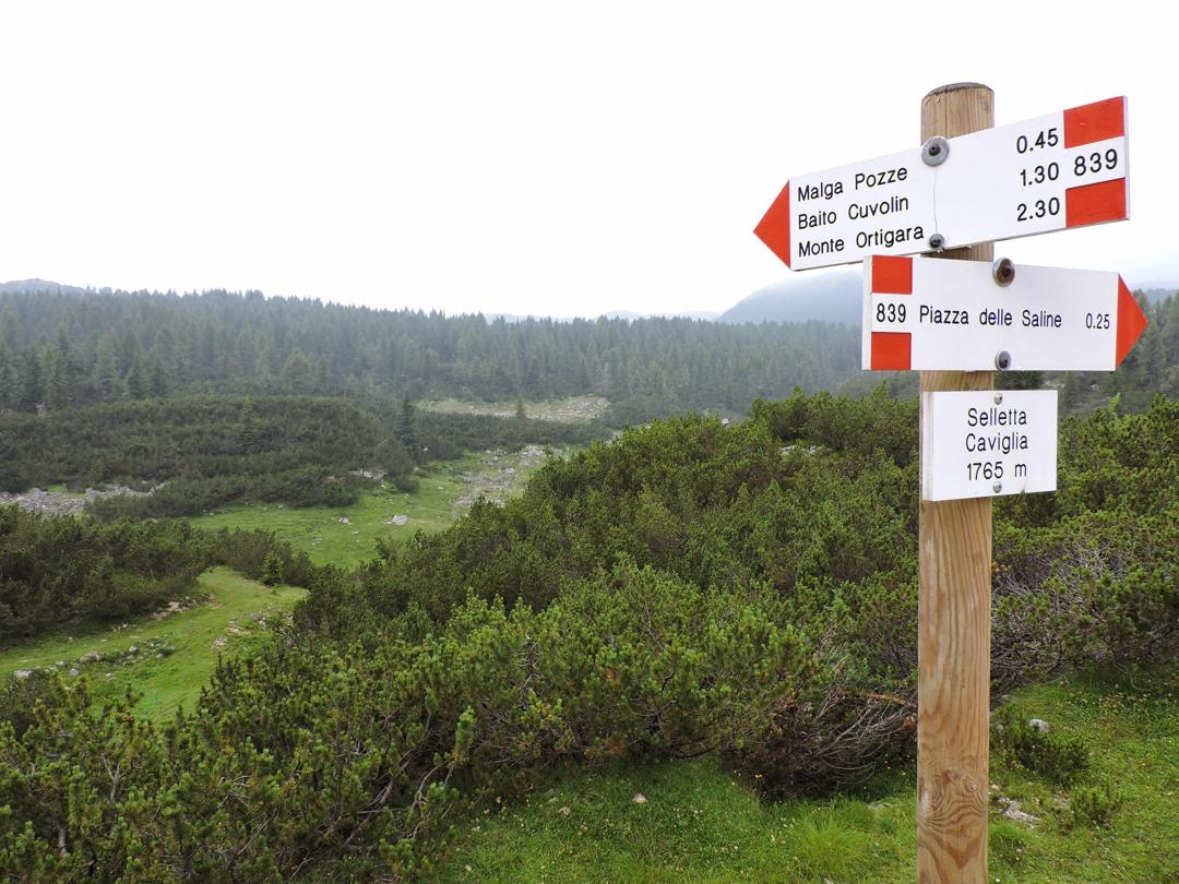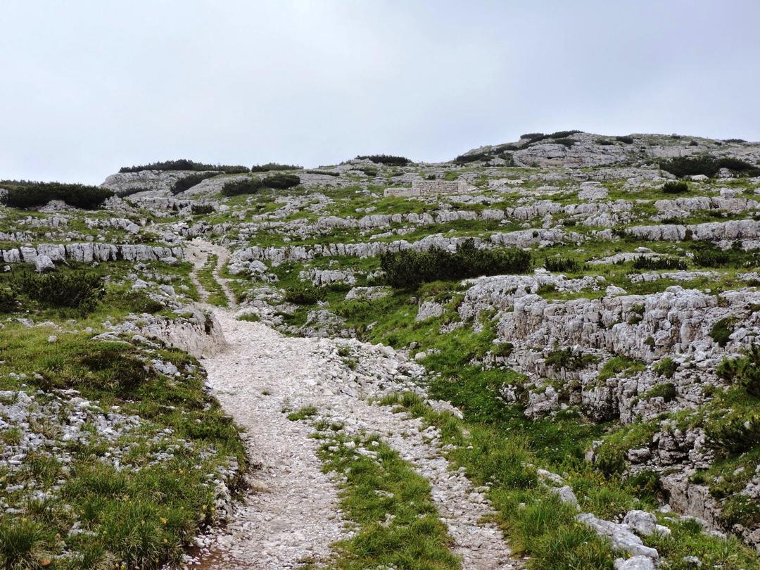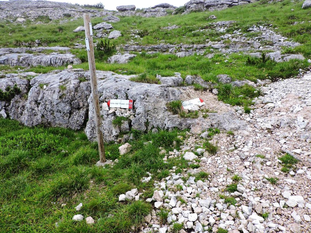 Si scende dalla selletta in direzione nord ovest passando vicino ad un baito distrutto ed un ex cimitero militare. In prossimità di Malga Pozze (che non si raggiunge) si trova il sentiero originale che scende verso sud ovest, bisogna proseguire salendo verso nord ovest.