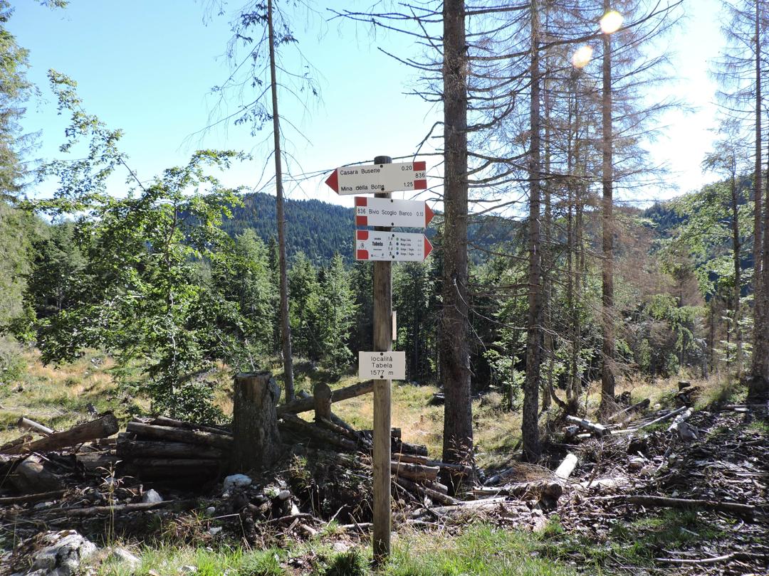 Pochi minuti di cammino e si arriva al cippo che indica la direzione per il monte Colombara, che indica: